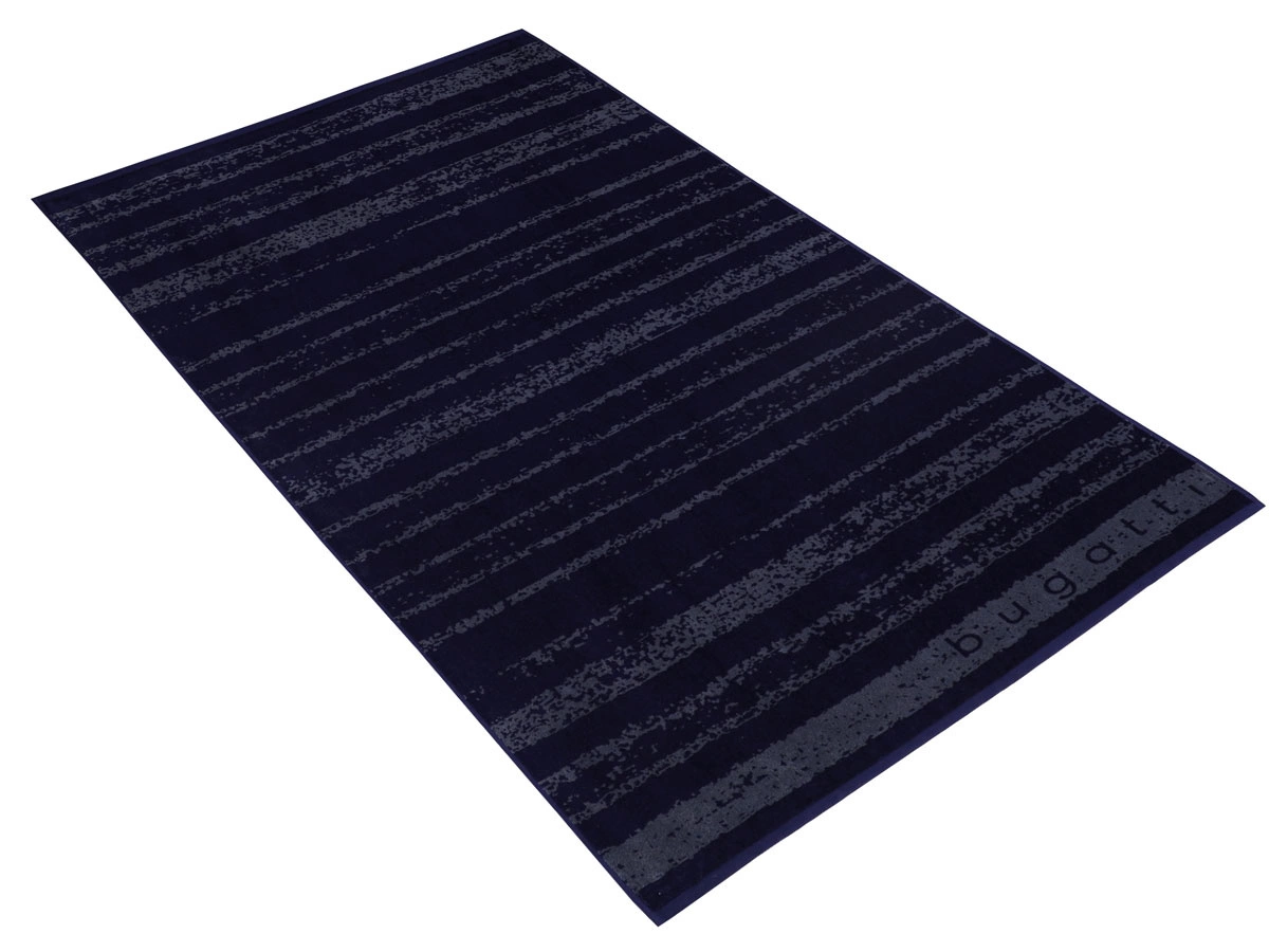 Nowoczesny ręcznik na plażę lub do sauny, Salerno marki bugatti. Wzór w przecierane paski, logo marki u dołu, kolor granatowy. Welurowy, wykonany w 100% z bawełny z ekologicznych upraw.