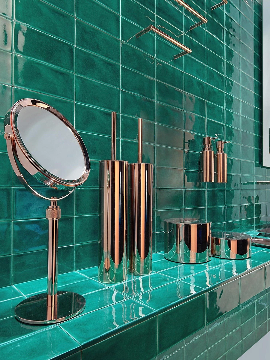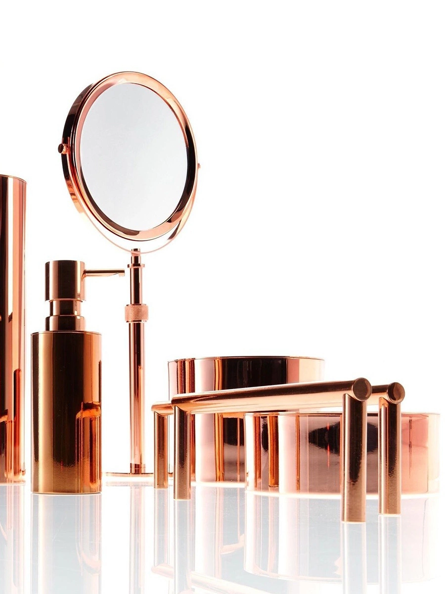 - Smukła i minimalistyczna, montowana do ściany szczotka do WC z drążkiem z pokrywką. Miedziane wykończenie w kolorze różowego złota stworzy niezapomniany klimat w łazience.