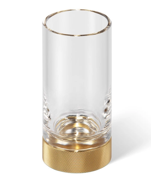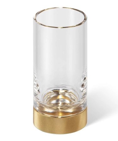 Kryształowy kubek łazienkowy Club SMG złoty z ozdobnym pierścieniem na podstawie. Kryształ gładki - bez zdobień. Pierścień z mosiądzu, pokryty 24 karatowym złotem.