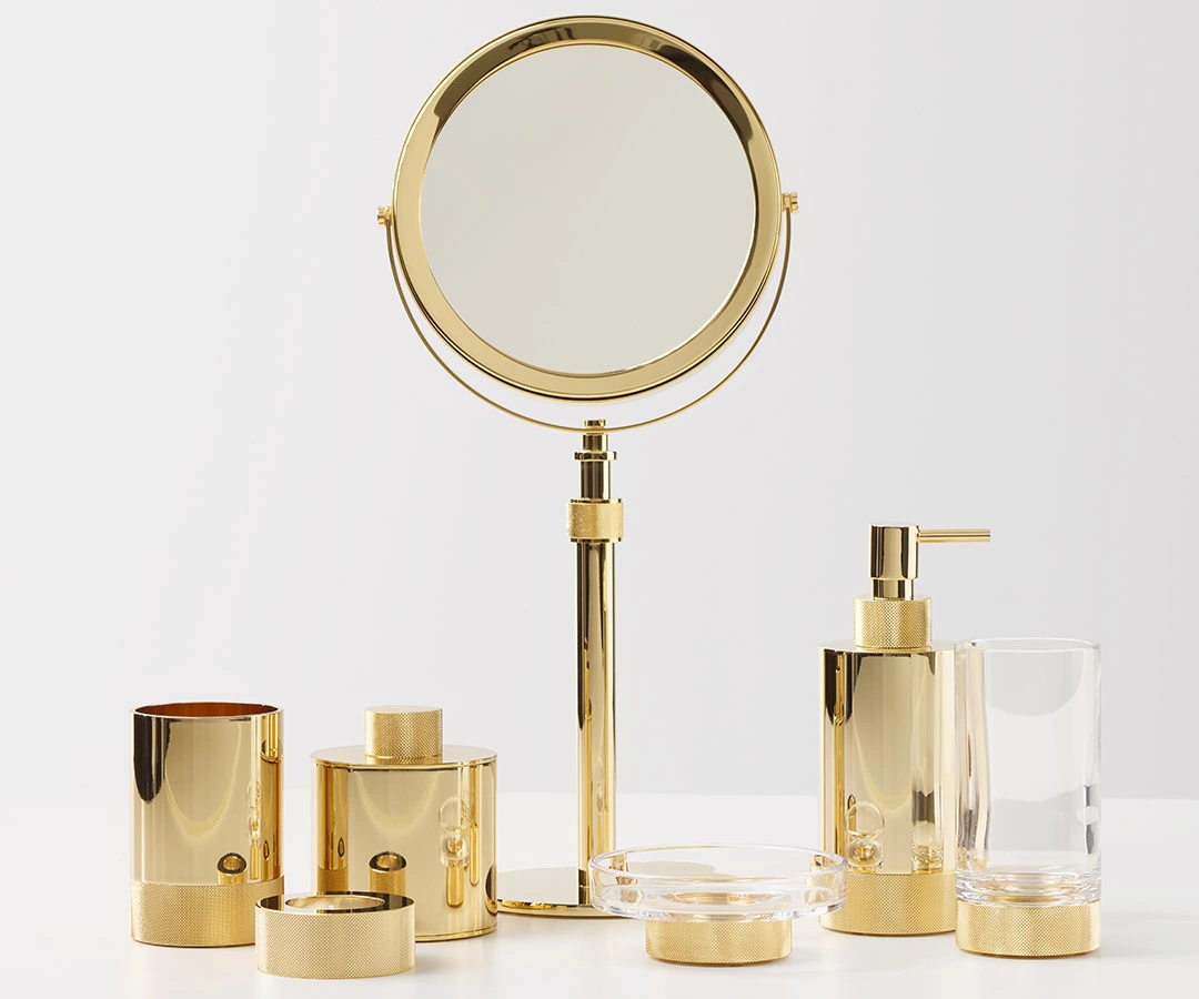 - Kryształowy kubek łazienkowy Club SMG złoty z ozdobnym pierścieniem na podstawie. Kryształ gładki - bez zdobień. Pierścień z mosiądzu, pokryty 24 karatowym złotem.