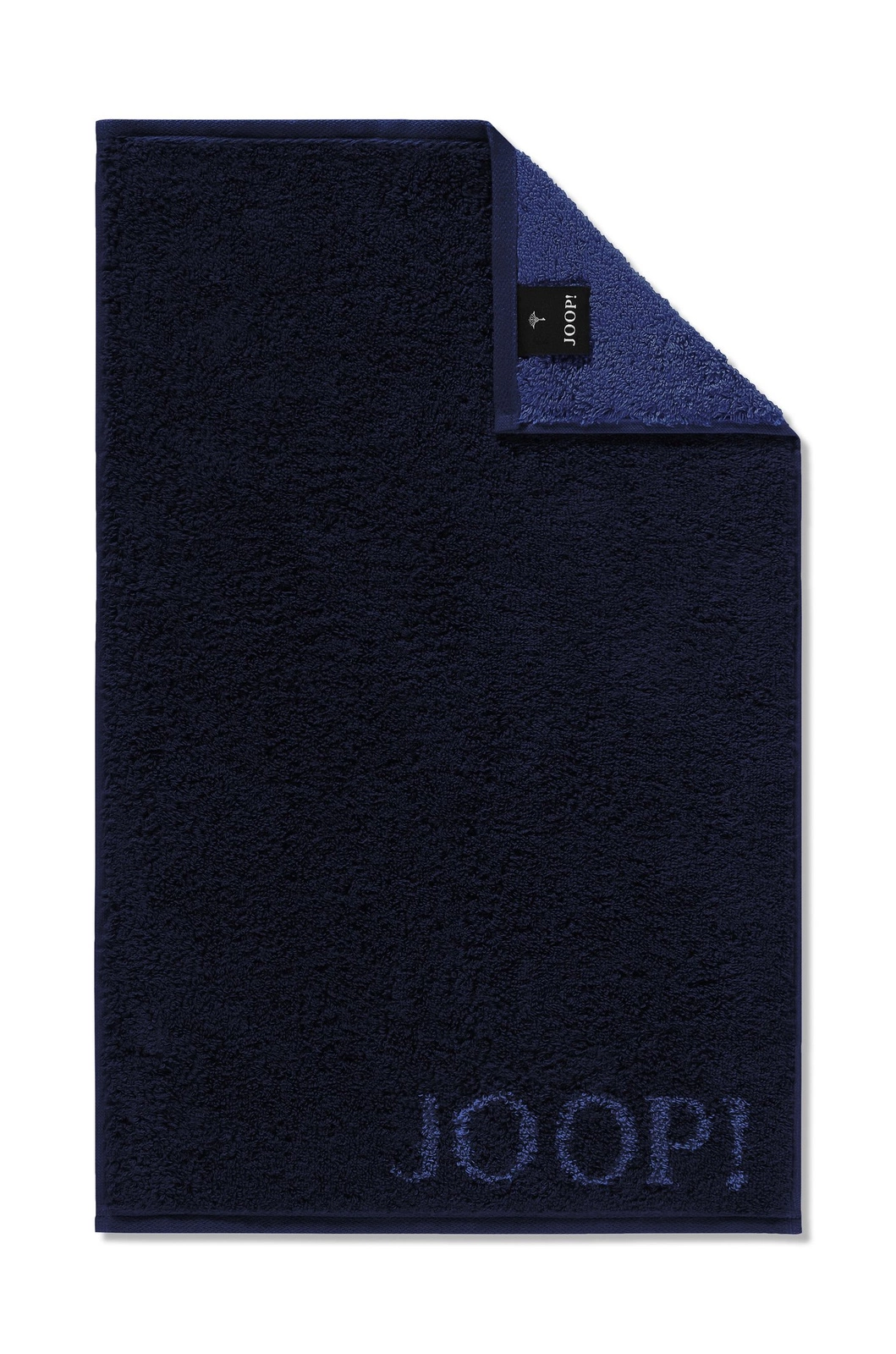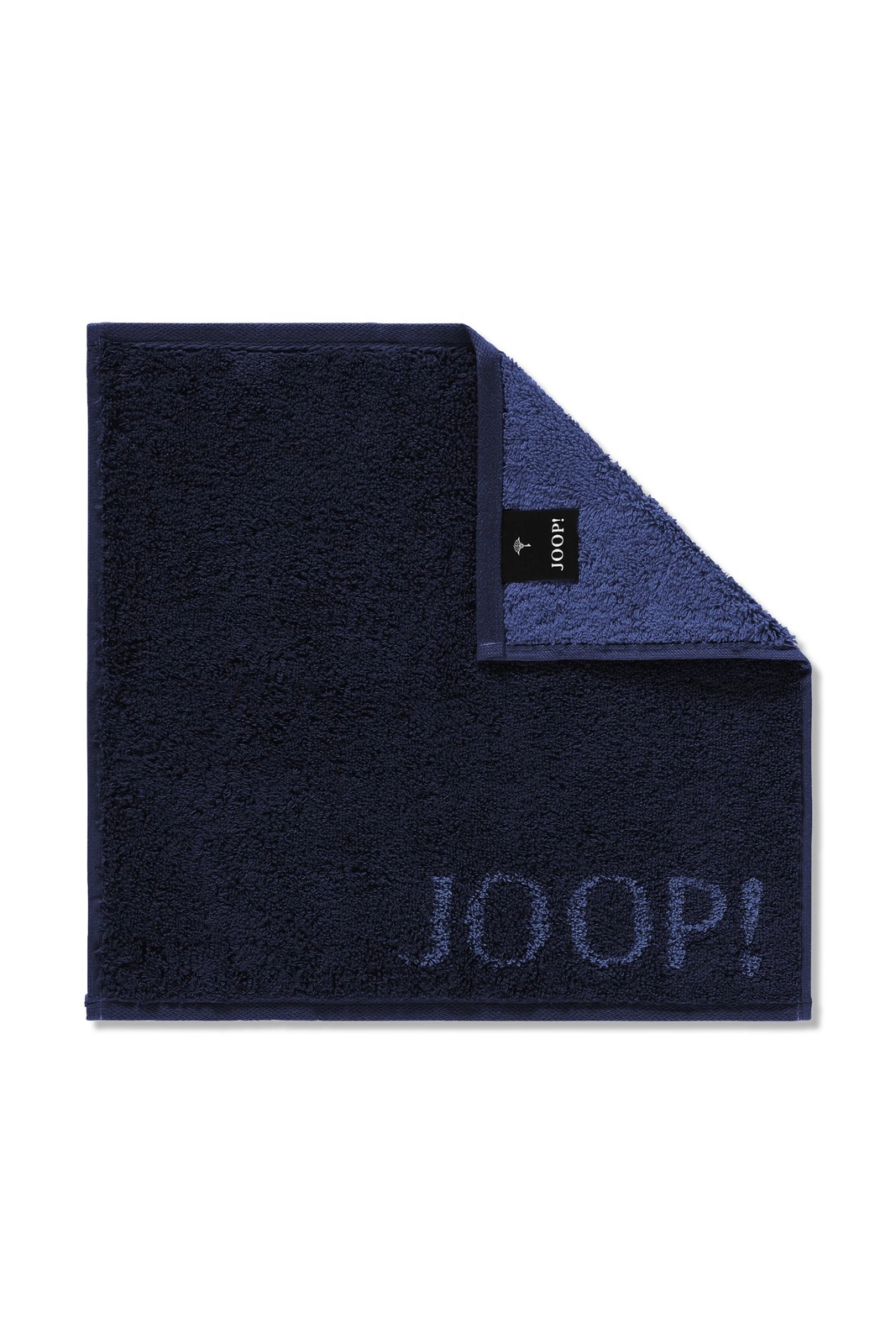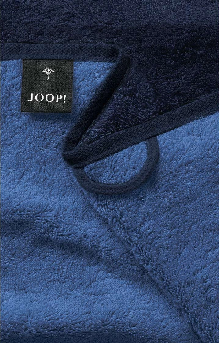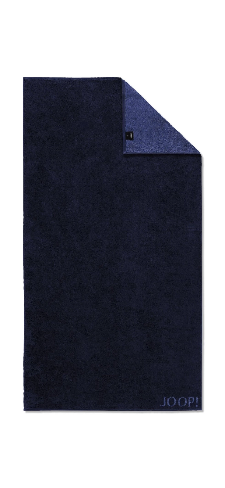 Dwustronny ręcznik łazienkowy z kolekcji Classic Doubleface 1600-14, marki JOOP!. Z jednej strony głęboki granat, z drugiej kolor niebieski. U dołu logo marki. Puszysty i miękki, na długo zachowuje swoje właściwości. U góry wszyty haczyk do powieszenia.