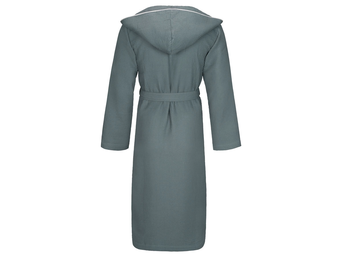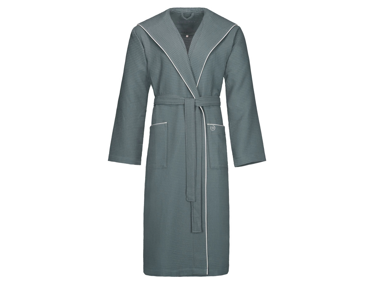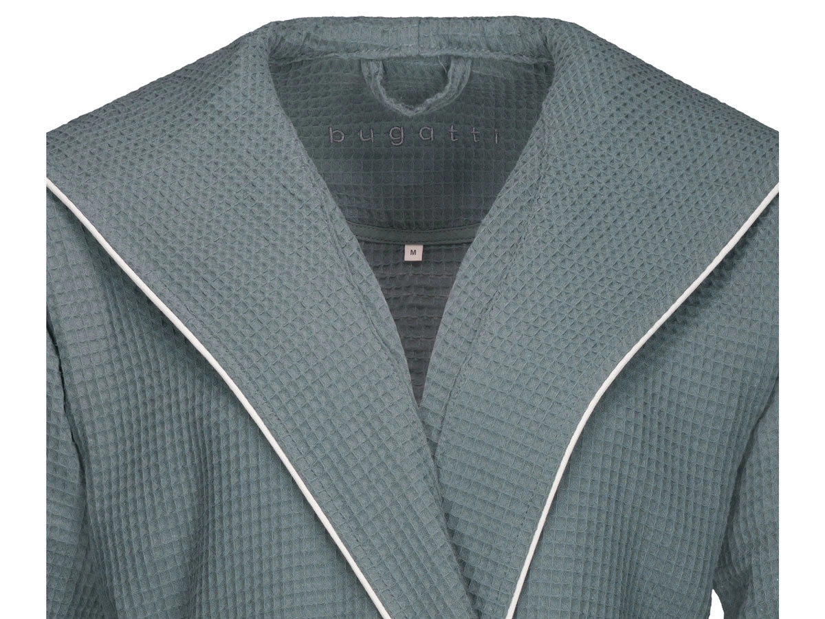 Cienki, gofrowany szlafrok z kapturem Tizian Flanell marki bugatti. Kolor szary, wykończony kontrastową bizą. Lekki i przyjemny w dotyku. Wyposażony w dwie kieszenie.