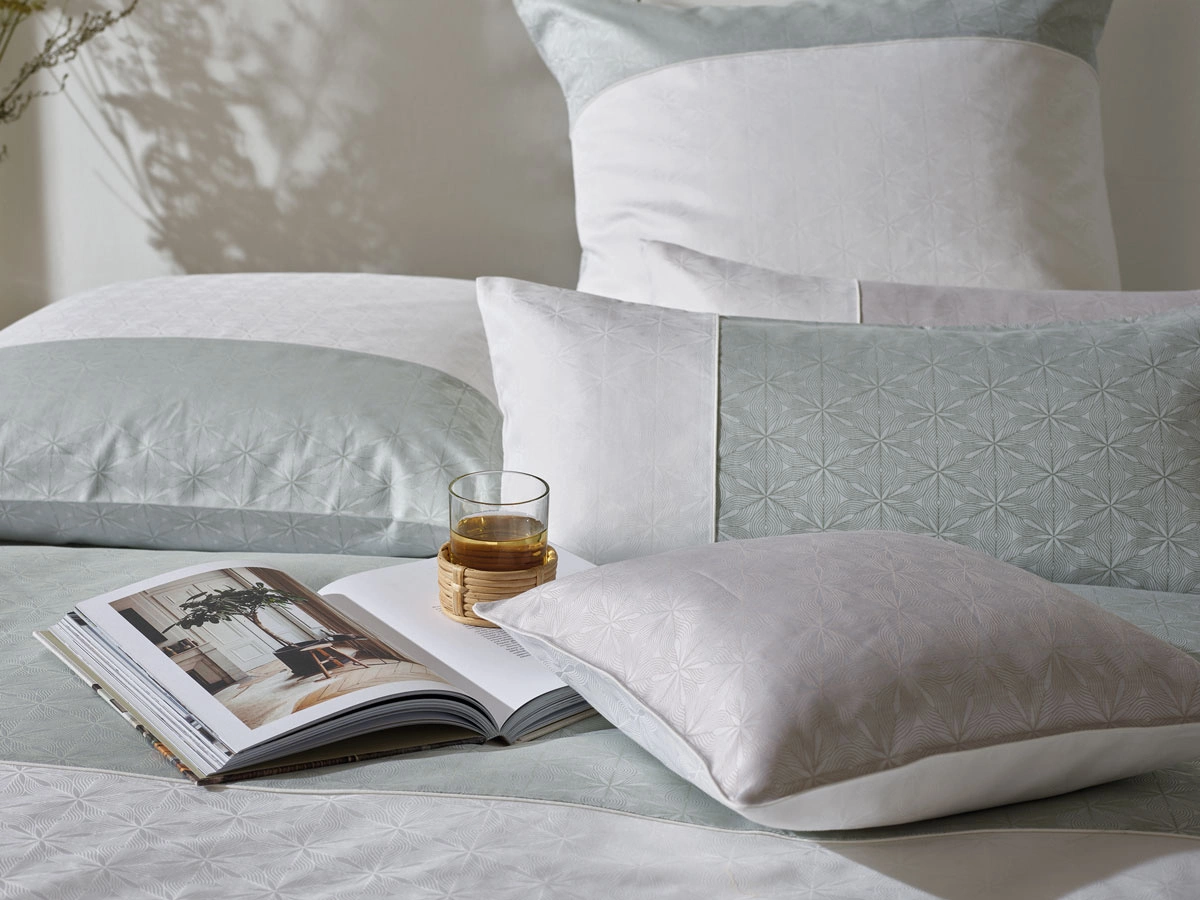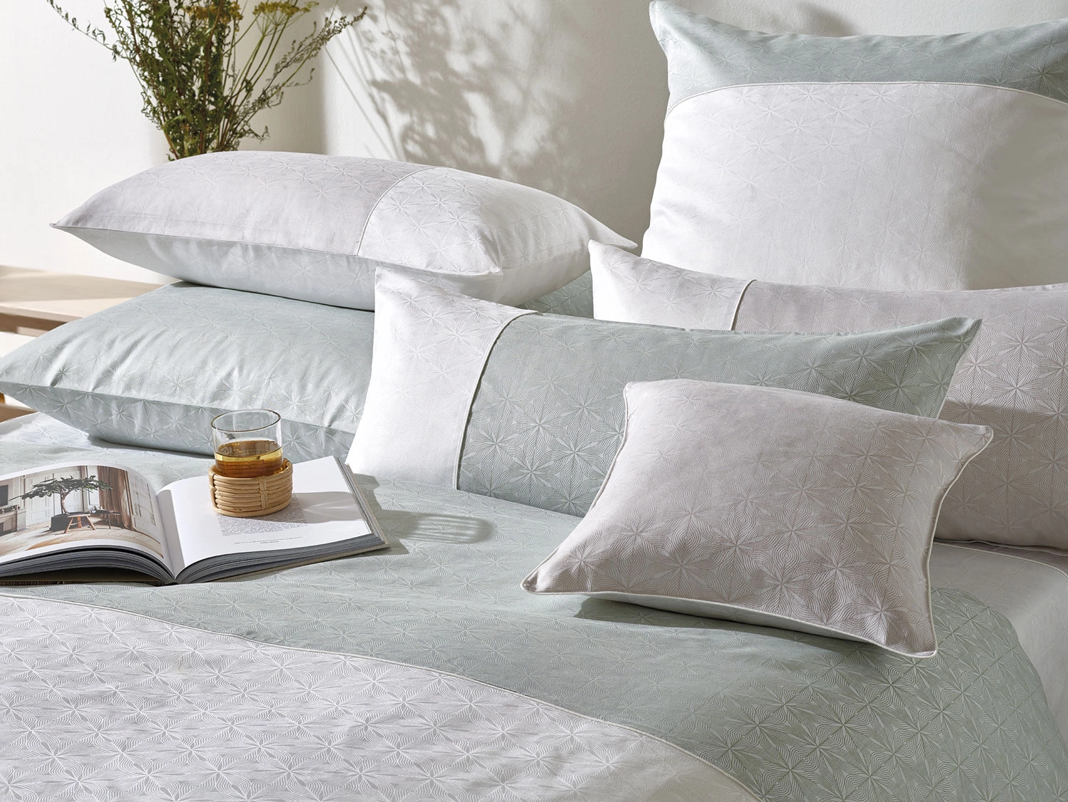 - Pościel Graceful 9026-0207 niemieckiej marki Curt Bauer. Powtarzalny wzór układający się w delikatne gwiazdy, w kolorach zgaszonej zieleni i srebra. Wykonana z najwyższej jakości mako-adamaszku (100% bawełna). Dodatkowo merceryzowana.