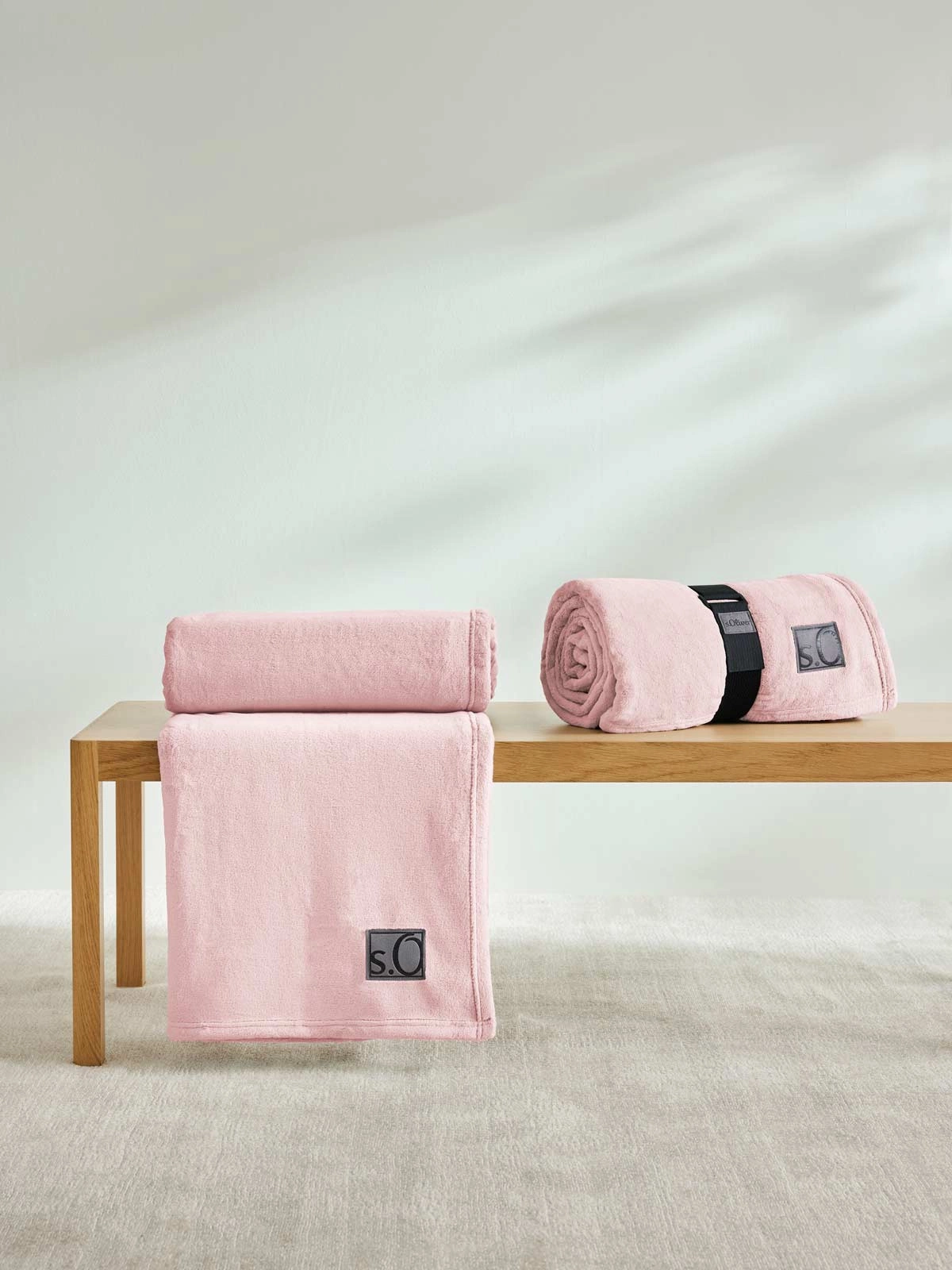 - Miękki, jednobarwny koc Kuschelsoft 3638-500 marki S.Oliver. Kolor pudrowy róż. Wyposażony w pasek dla łatwego przechowywania i przenoszenia. Logo marki u dołu. Wykonany w 100% z supermiekkiego i trwałego włókna poliestrowego.