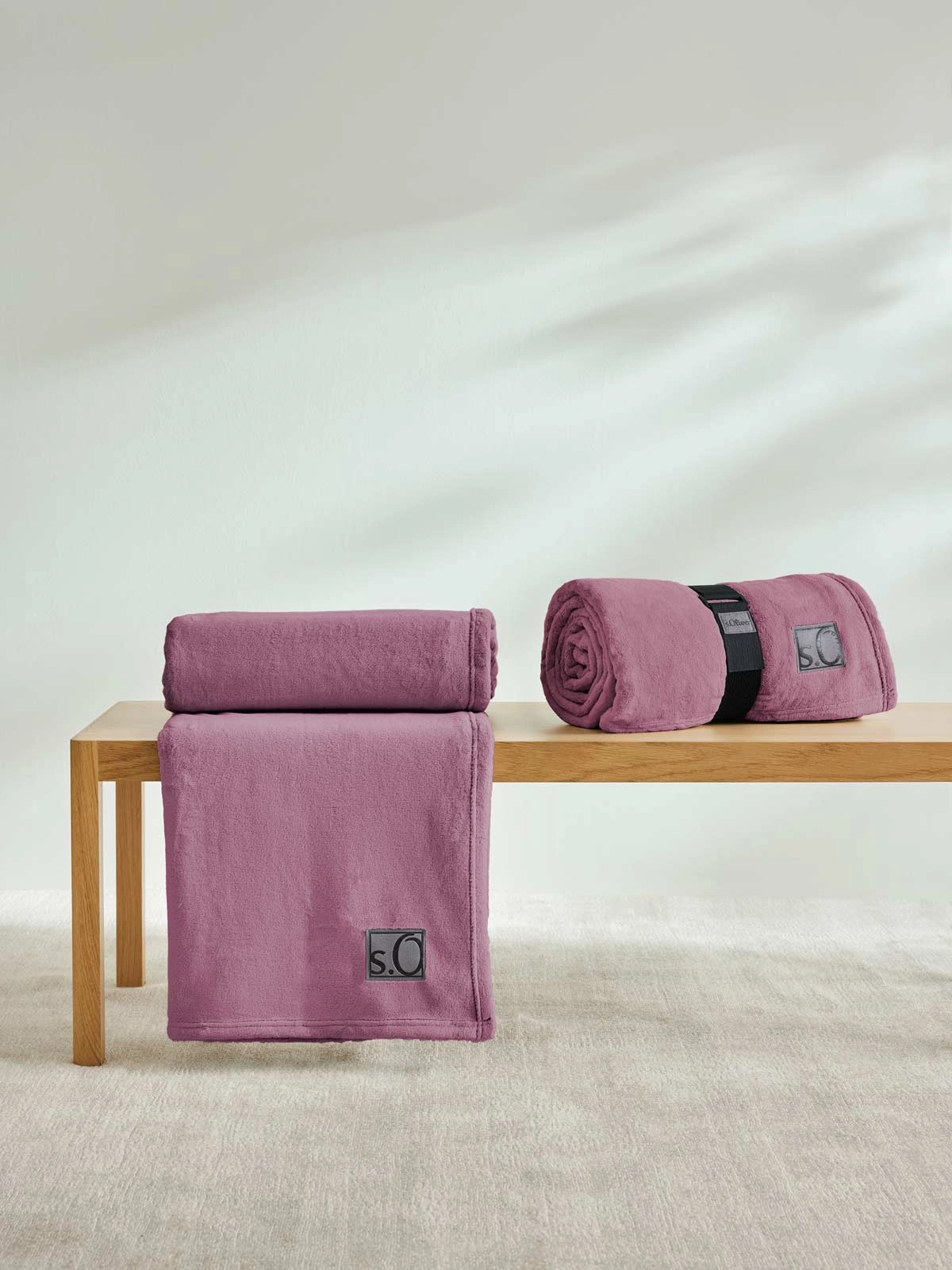- Miękki, jednobarwny koc Kuschelsoft 3638-544 marki S.Oliver. Kolor różowy. Wyposażony w pasek dla łatwego przechowywania i przenoszenia. Logo marki u dołu. Wykonany w 100% z supermiekkiego i trwałego włókna poliestrowego.