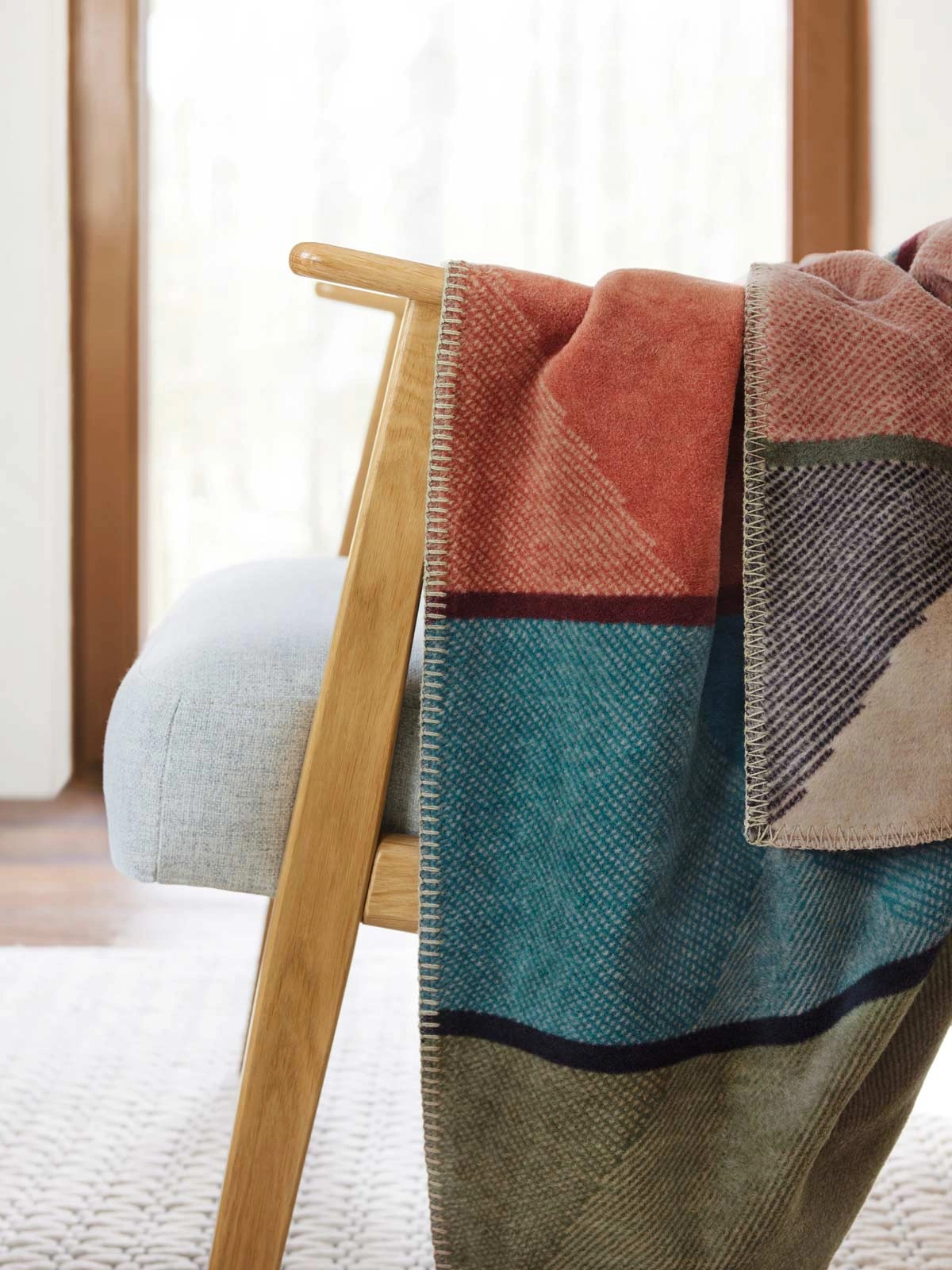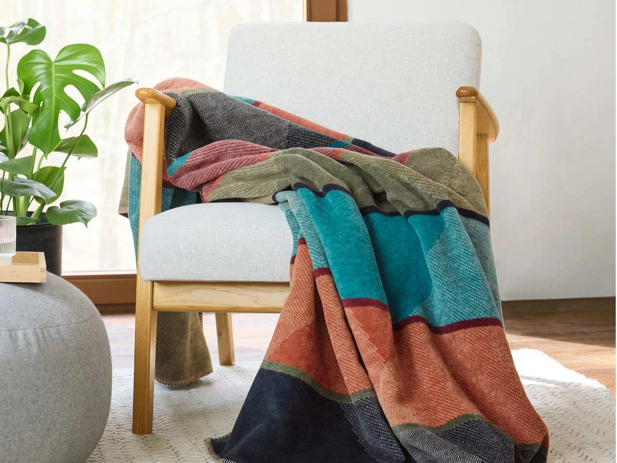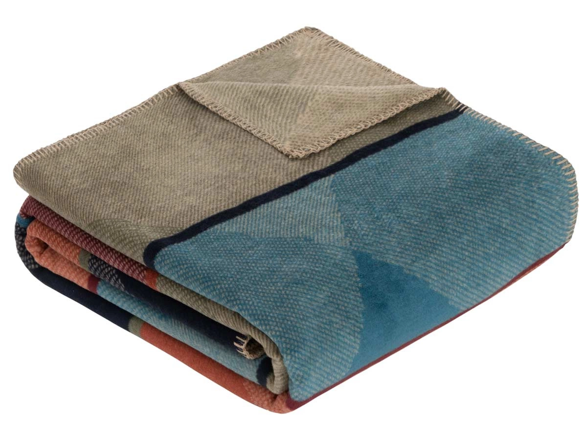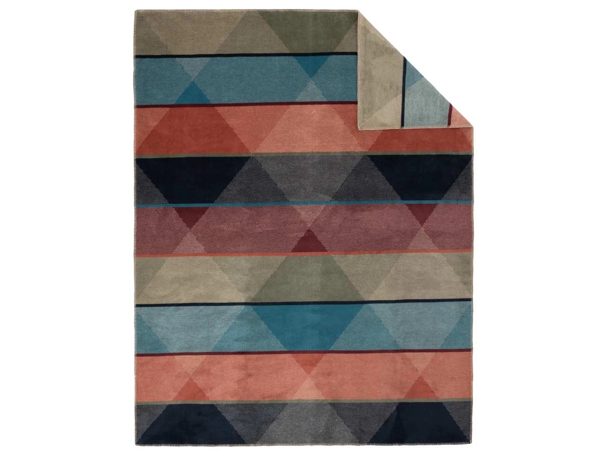 Wielokolorowy koc Alexandria od marki Ibena. Nowoczesny, geometryczny wzór w modnym połączeniu kolorystycznym. Wykonany z mieszanki bawełny z akrylem. Takie połączenie sprawia, że koc jest ciepły, miękki, bardzo trwały oraz łatwy w praniu. Wykończony ściegiem dzierganym.