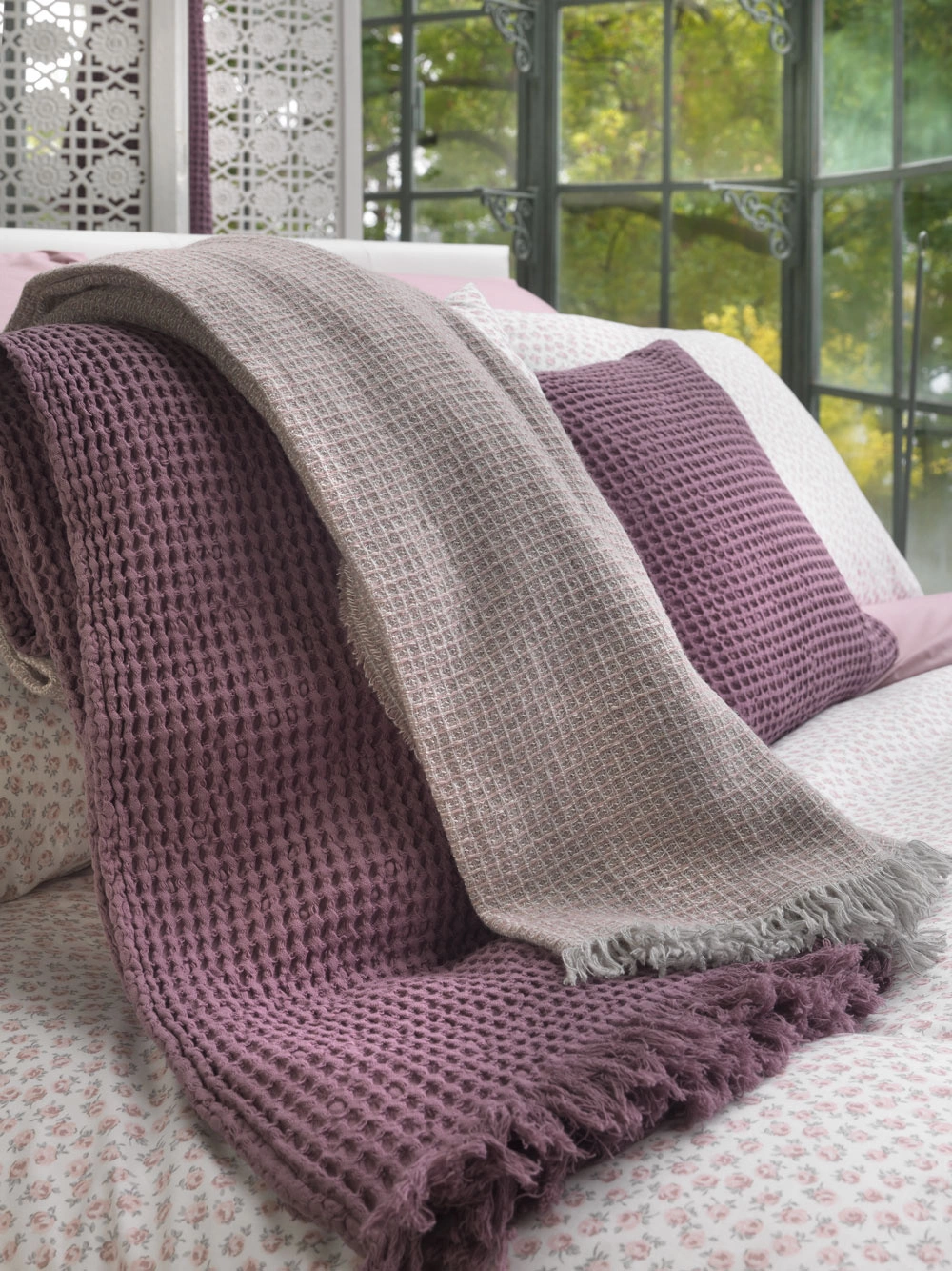 - Gofrowana narzuta Stone od włoskiej marki Bellora. Piękna, strukturalna tkanina, w kolorze różowym, wykonana ze 100% bawełny. Lekka, pomimo dużego rozmiaru łatwa do narzucenia na łóżko.