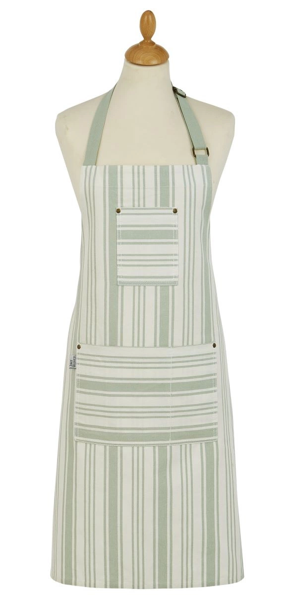 - Fartuch Sage Stripe marki Ulster Weavers. Pasy w kolorze szałwii na jasnym tle, w stylu industrialnym. Pojemna kieszeń, wykonany z bawełny. Możliwość regulacji paska wokół szyi oraz bioder.