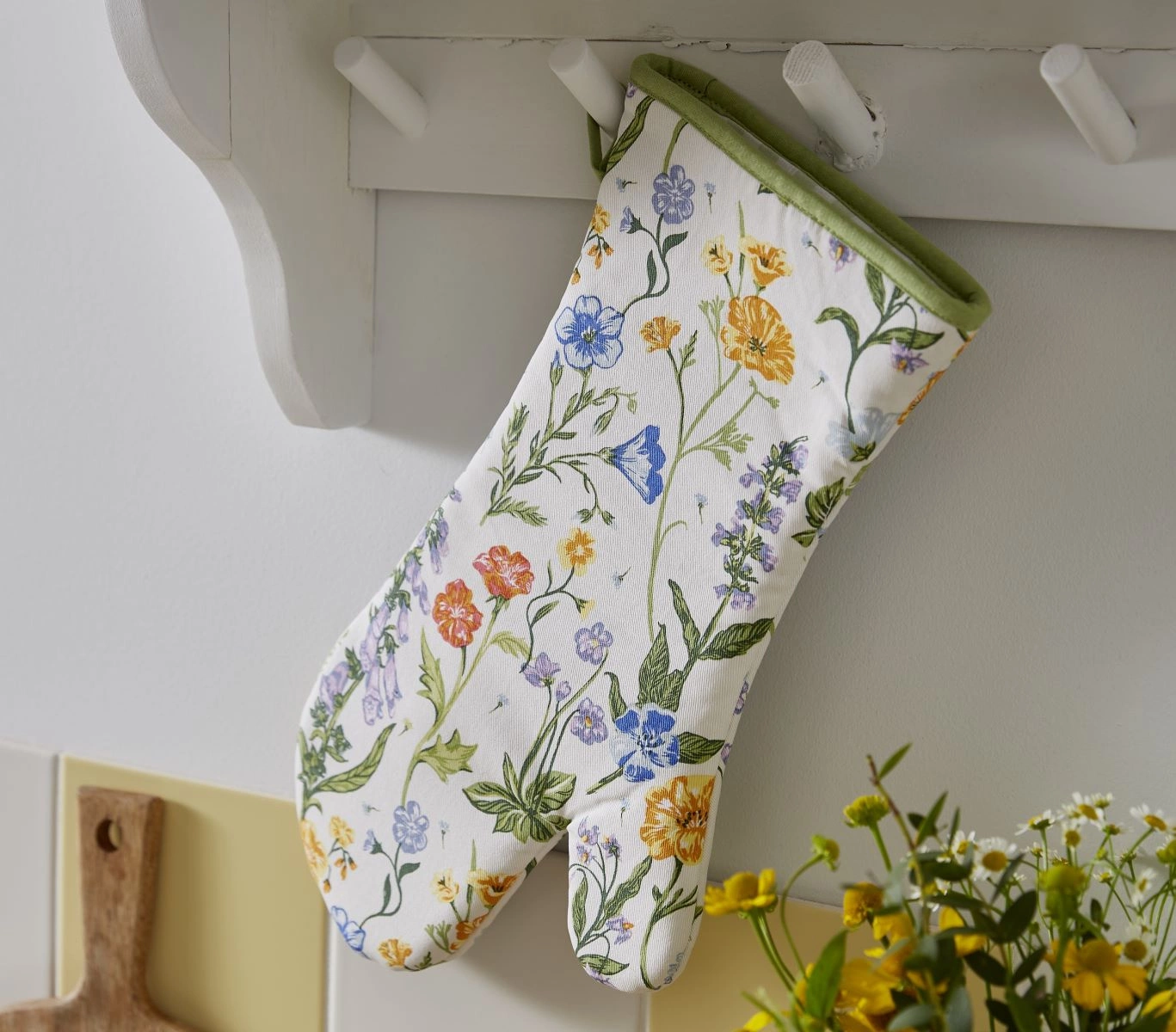 - Rękawica z kolekcji Cottage Garden marki Ulster Weavers, wzór w polne kwiaty. Stanowi ochronę dla dłoni przed gorącymi talerzami i tacami w kuchni. Wykonana w 100% z niebielonej bawełny z wypełnieniem poliestrowym.