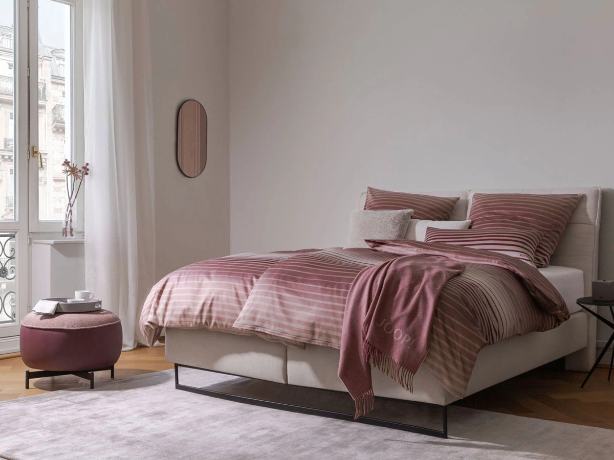 Kolekcja Fine Doubleface 804846 wykonana z wełny z dodatkiem kaszmiru. Pled wykończony frędzlami, z eleganckim logo JOOP!, w kolorze rouge z bordoeymi frędzlami. Wyjątkowo miękki i przyjemny w dotyku.