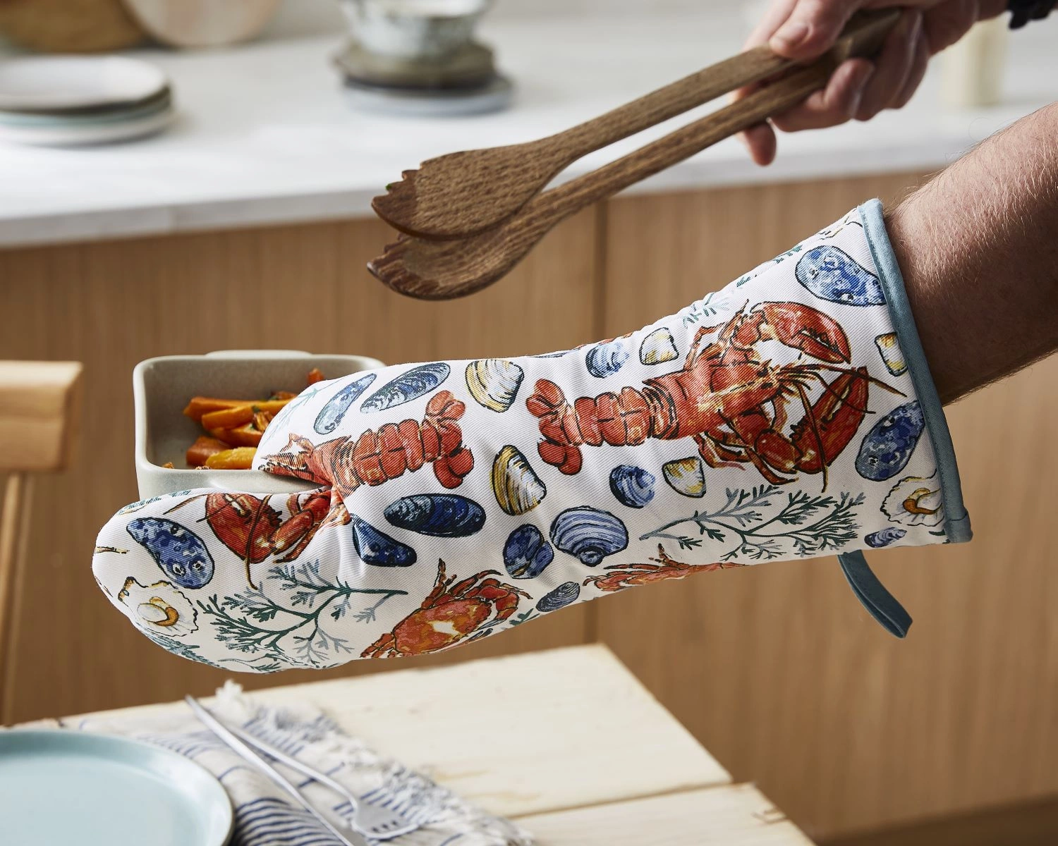 Rękawica z kolekcji Shellfish marki Ulster Weavers, wzór w owoce morza - homary, kraby, muszle. Stanowi ochronę dla dłoni przed gorącymi talerzami i tacami w kuchni. Wykonana w 100% z niebielonej bawełny z wypełnieniem poliestrowym.