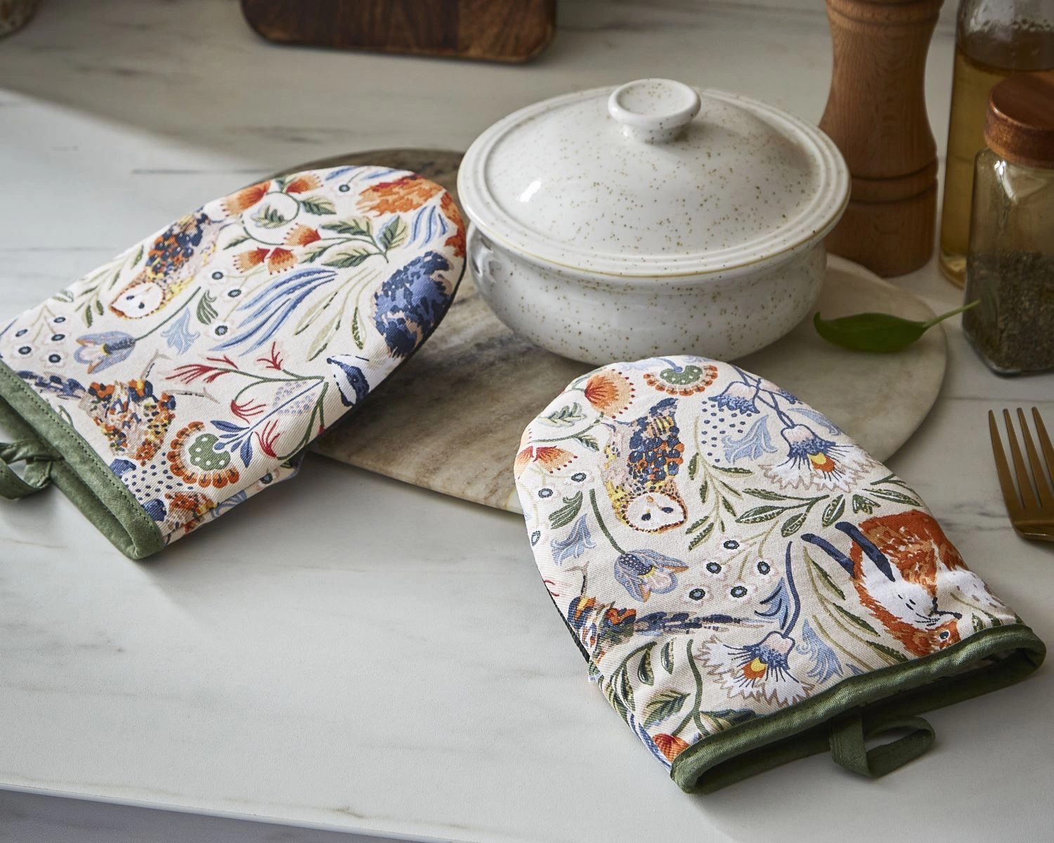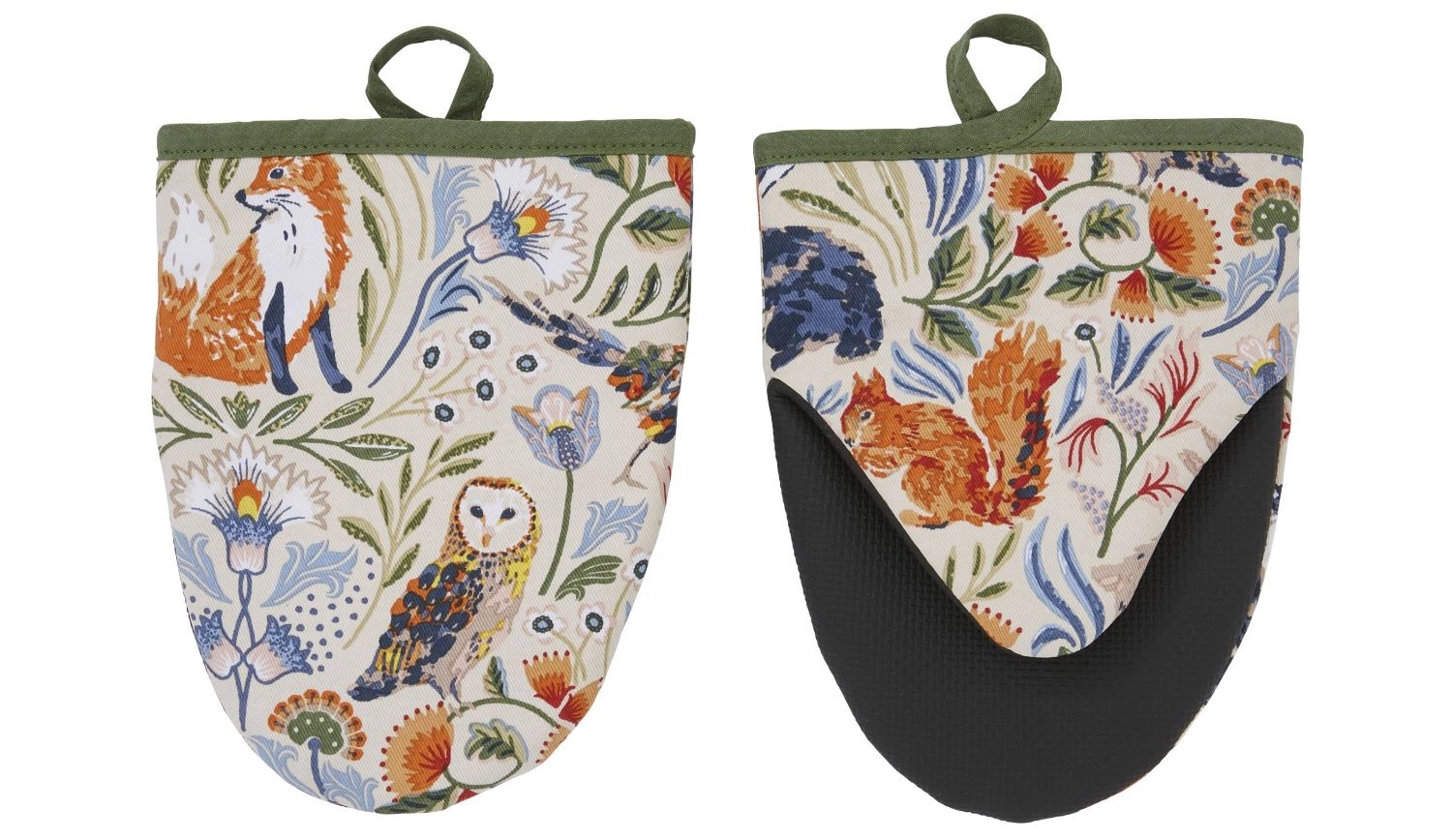 Komplet mikro rękawic ochronnych z kolekcji Blackthorn. Wzór o motywach leśnych - w wiewiórki, sowy, zające oraz bażanty, i kwiaty. Chroni dłonie przed gorącymi blachami. Wykonana w 100% z bawełny z wypełnieniem z poliestrowym dla ochrony.