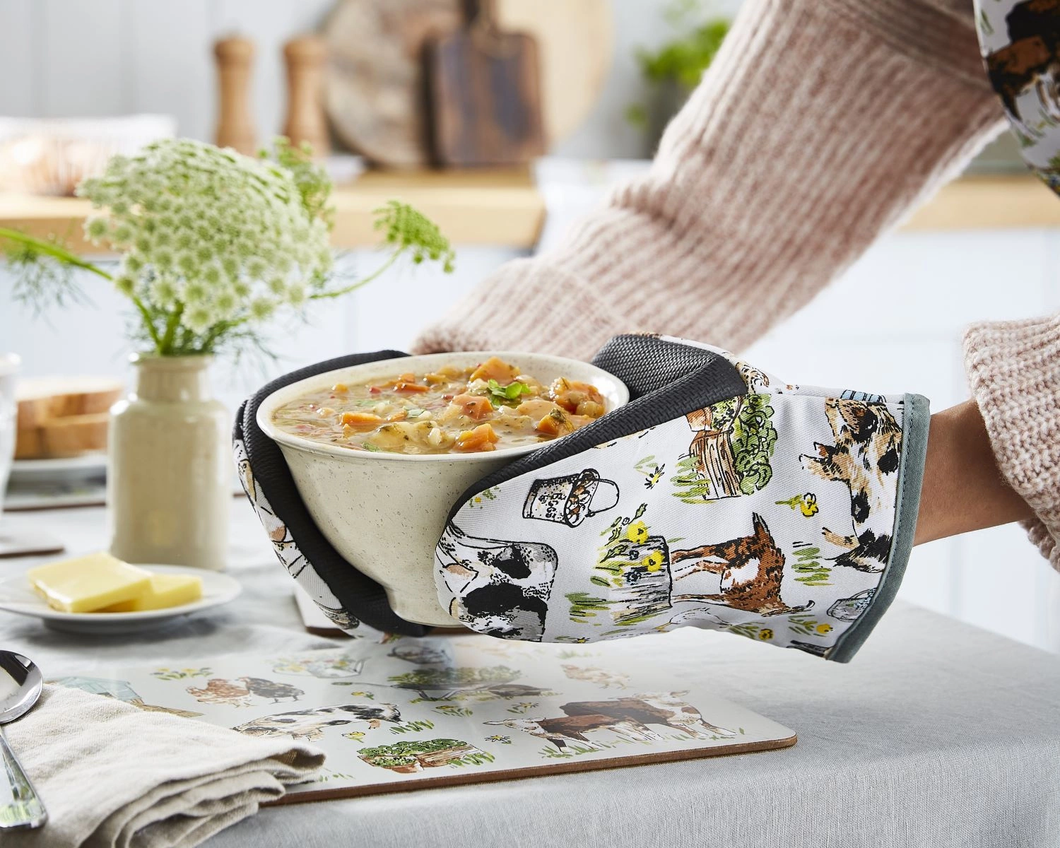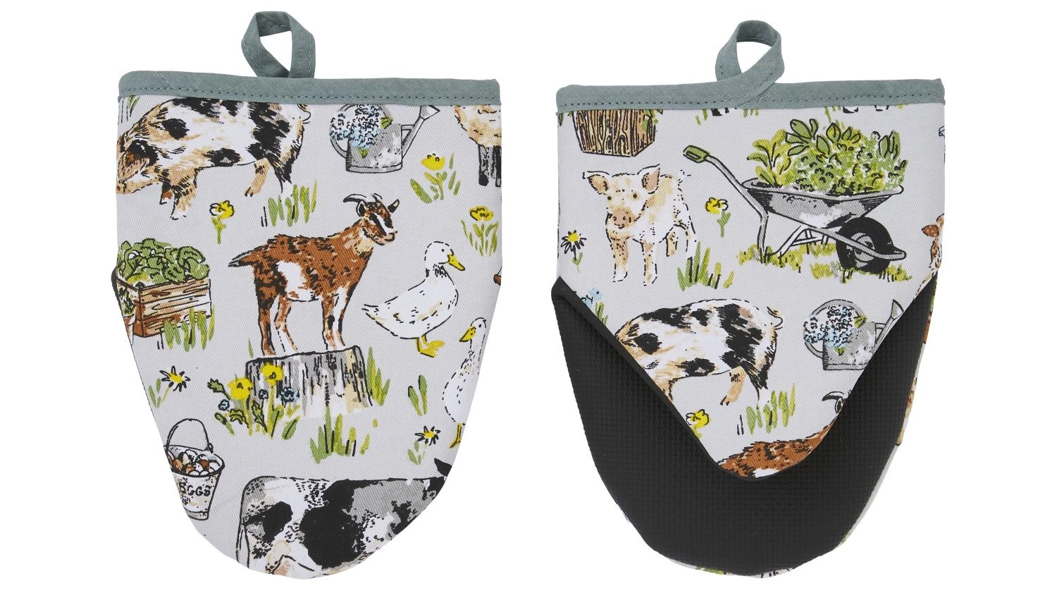 Komplet mikro rękawic ochronnych z kolekcji Portman Farm. Wzór w zwierzęta farmerskie na szarym tle. Chroni dłonie przed gorącymi blachami. Wykonana w 100% z bawełny z wypełnieniem z poliestrowym dla ochrony.