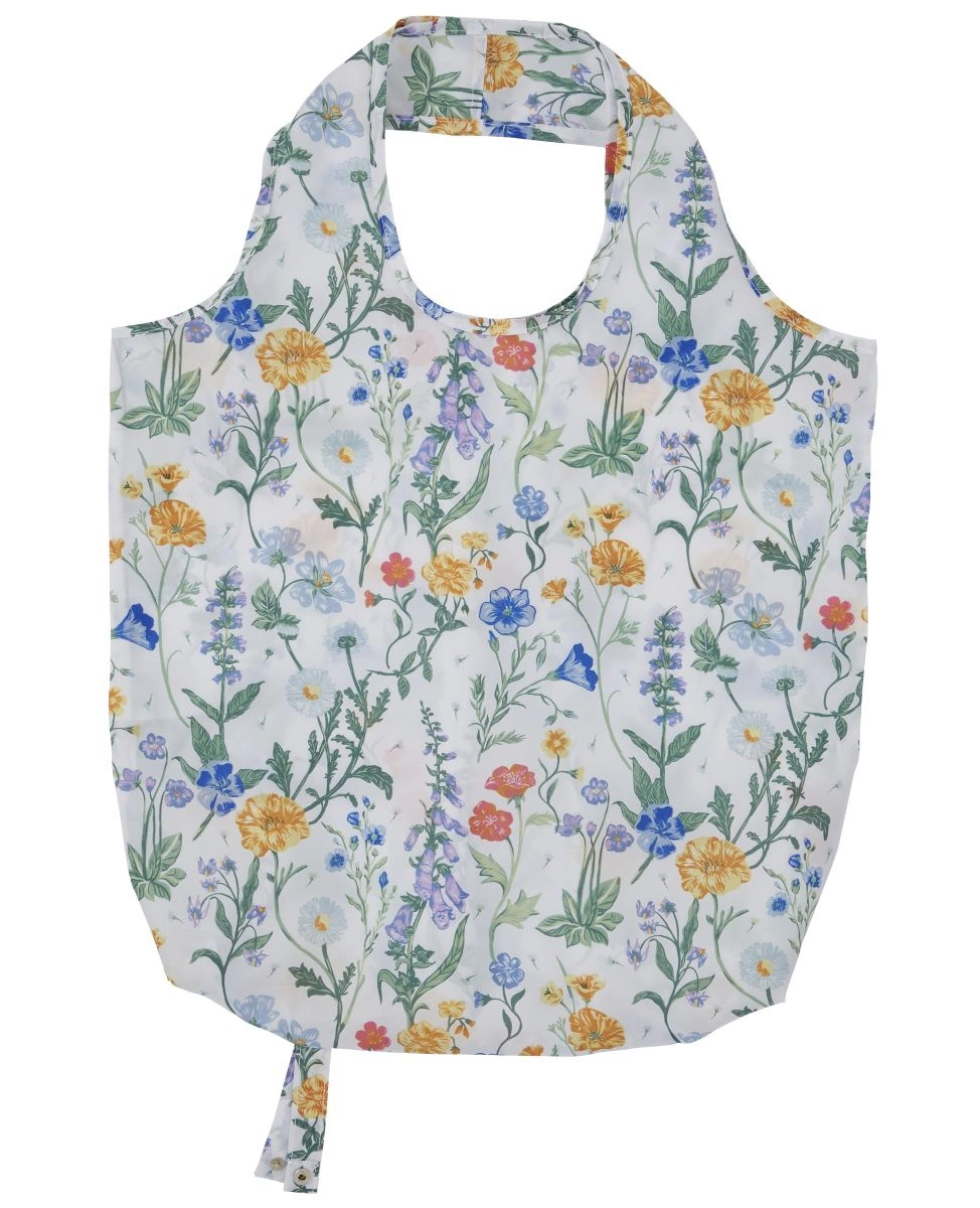 Siatka na zakupy Cottage Garden. Wzór w kolorowe polne kwiaty. Dzięki łatwemu zwinięciu i zapięciu na guziki, może być przechowywana w torebce lub kieszeni.
