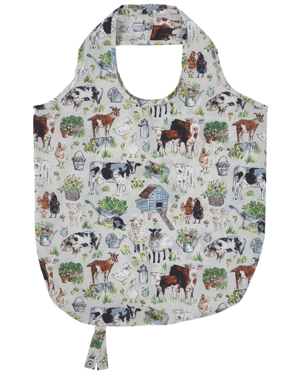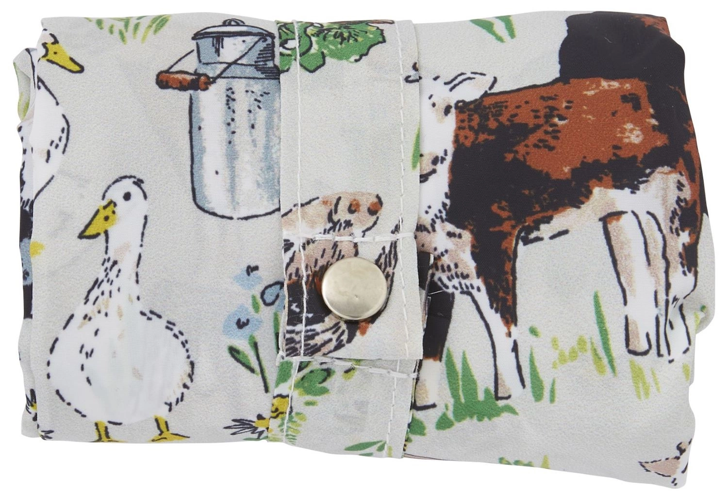 - Siatka na zakupy Portman Farm. Zwierzęta farmerskie na szarym tle. Dzięki łatwemu zwinięciu i zapięciu na guziki, może być przechowywana w torebce lub kieszeni.