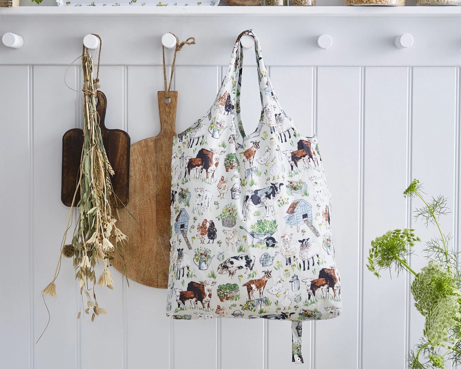 Siatka na zakupy Portman Farm. Zwierzęta farmerskie na szarym tle. Dzięki łatwemu zwinięciu i zapięciu na guziki, może być przechowywana w torebce lub kieszeni.