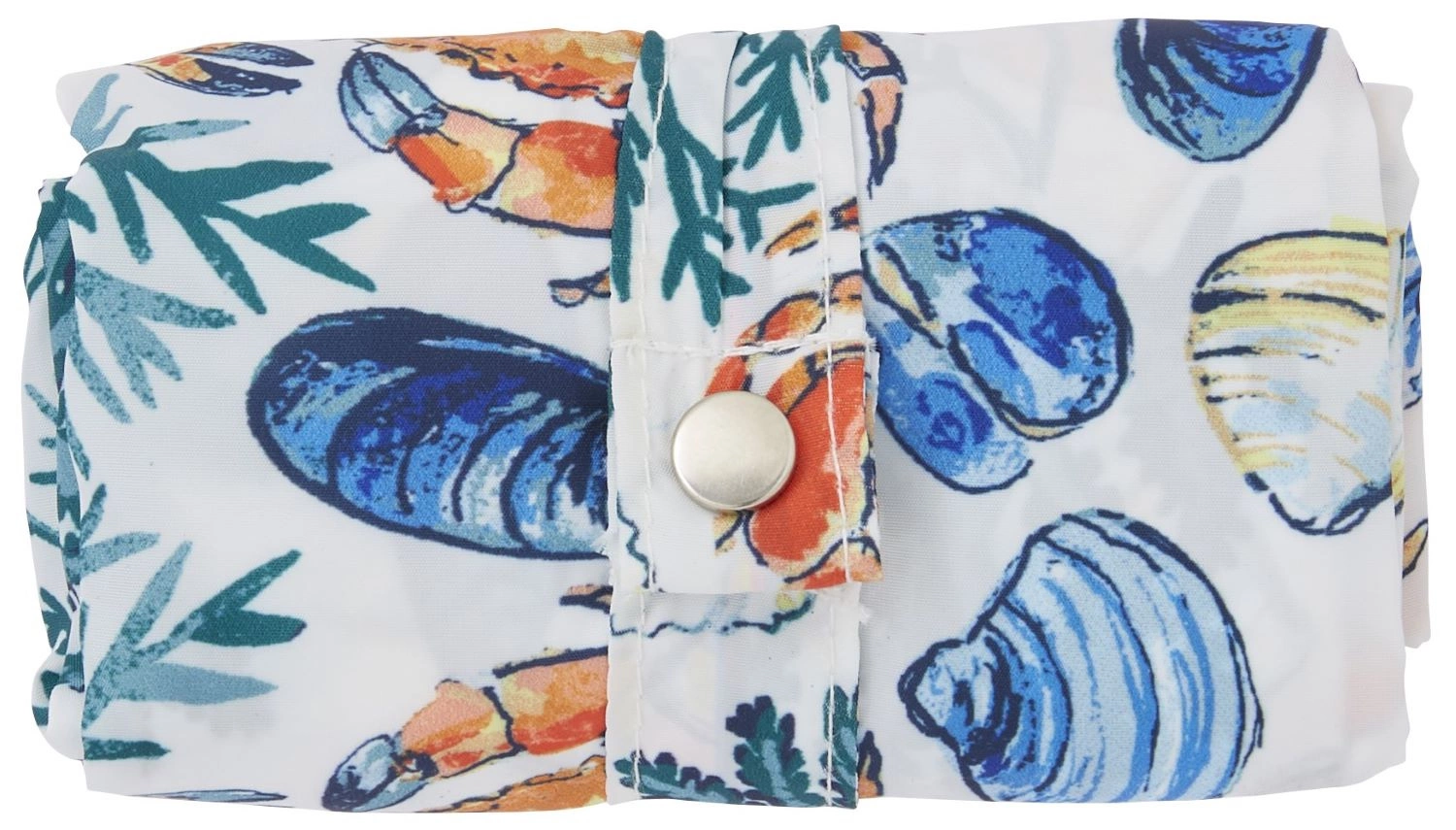 Siatka na zakupy Shellfish. Wzór w zwierzęta morskie - homary, kraby i muszle. Dzięki łatwemu zwinięciu i zapięciu na guziki, może być przechowywana w torebce lub kieszeni.