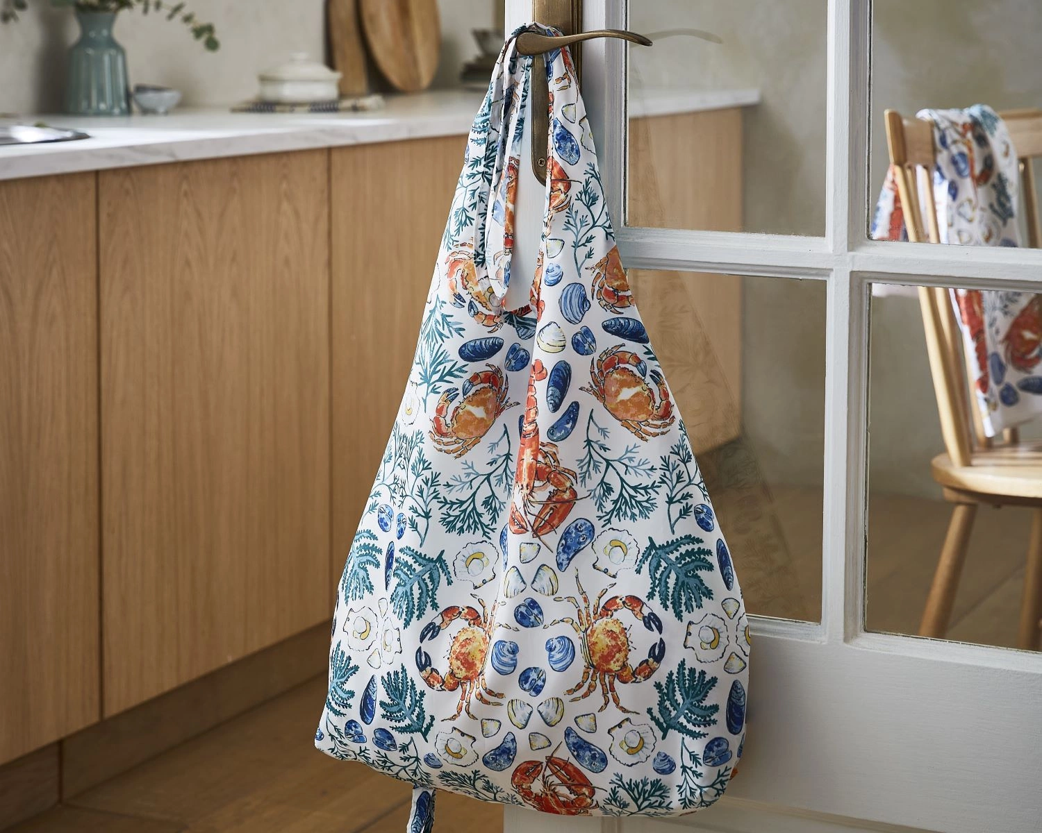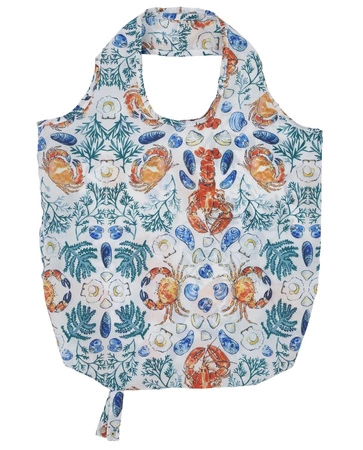 • Siatka na zakupy Shellfish. Wzór w zwierzęta morskie - homary, kraby i muszle. Dzięki łatwemu zwinięciu i zapięciu na guziki, może być przechowywana w torebce lub kieszeni.