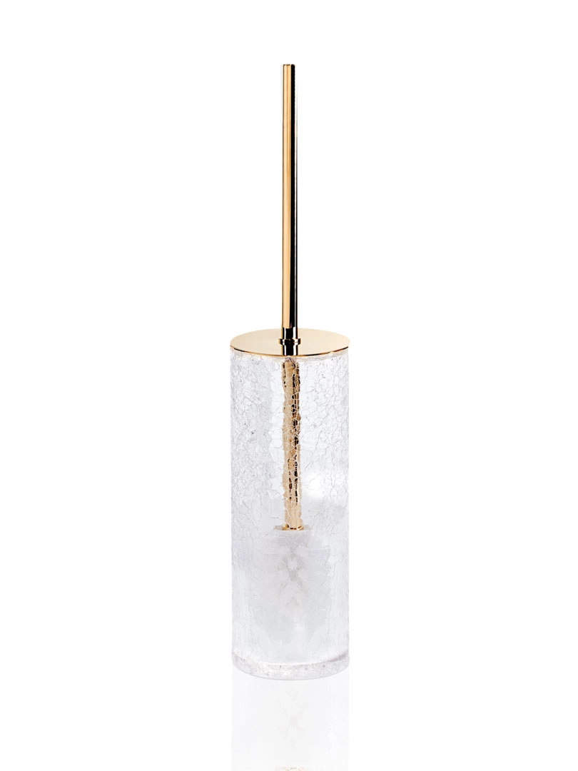 - Szczotka z pokrywką do WC CR SBG marki Decor Walther. Wykonana z „craquele glas” – szkła o z delikatną „spękaną strukturą”. U u dołu, w miejscu szczotki, szkło delikatnie mleczne. Drążek wykonany ze złoconego mosiądzu.