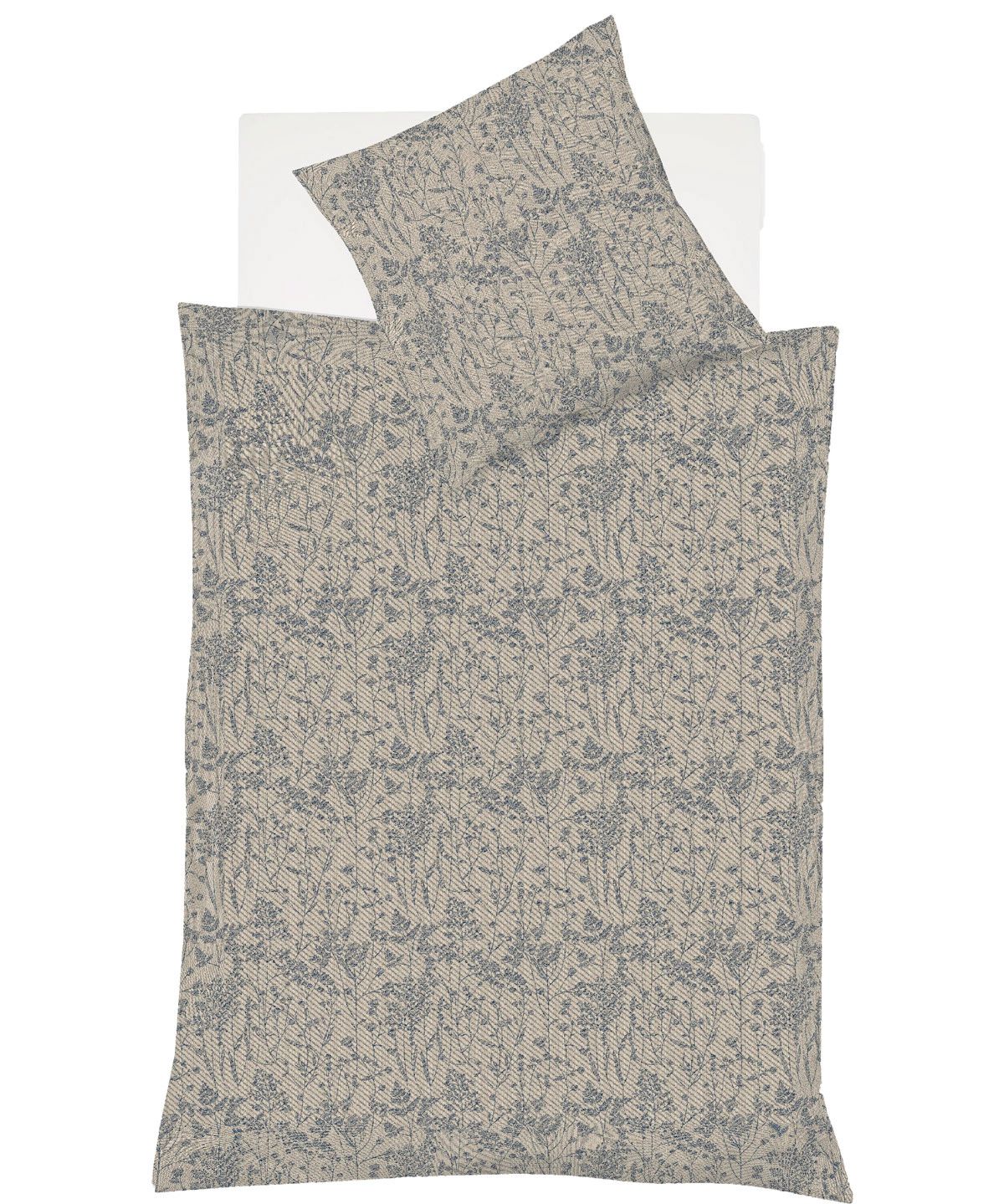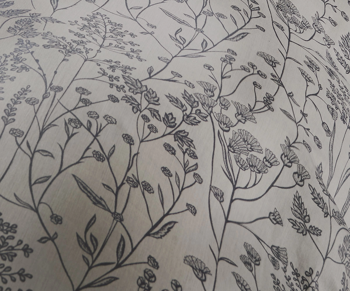 Pościel z mako-adamaszku, model 484315 od marki Fleuresse. Łąkowy motyw w kolorach beżu i szarości. Wzór uzyskiwany poprzez odpowiednie ułożenie nici na maszynie tkackiej - nie drukowany. Najwyższej jakości bawełna mako.