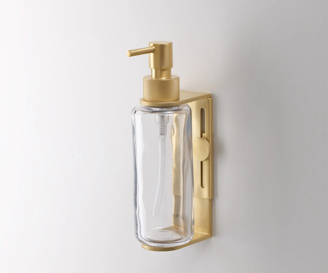 - Naścienny uchwyt na dozownik do mydła marki Decor Walther z kolekcji PORTER. Wykonany z mosiądzu pokrytego 24 karatowym matowym złotem. Regulowana wysokość sprawia łatwe dopasowanie do ulubionego modelu.