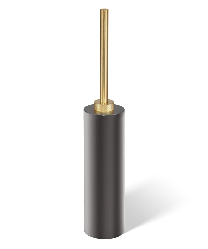 Wolnostojąca szczotka toaletowa o cylindrycznym kształcie, CENTURY SBG, marki Decor Walther. Wykonana z mosiądzu w kolorze ciemnego metalu, przy uchwycie pokrytym 24 karatowym złotem ozdobne wykończenie. Posiada wkład higieniczny.