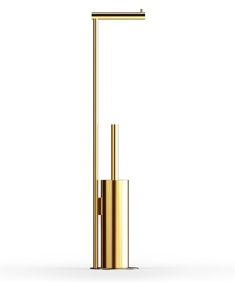 - Zestaw WC na papier toaletowy i szczotkę z kolekcji BAR z marki Decor Walther. Masywny, cylindryczny kształt, na okrągłej podstawie z wewnętrznym akrylowym, higienicznym wkładem. Wykonany z mosiądzu pokrytego 24-karatowym złotem.