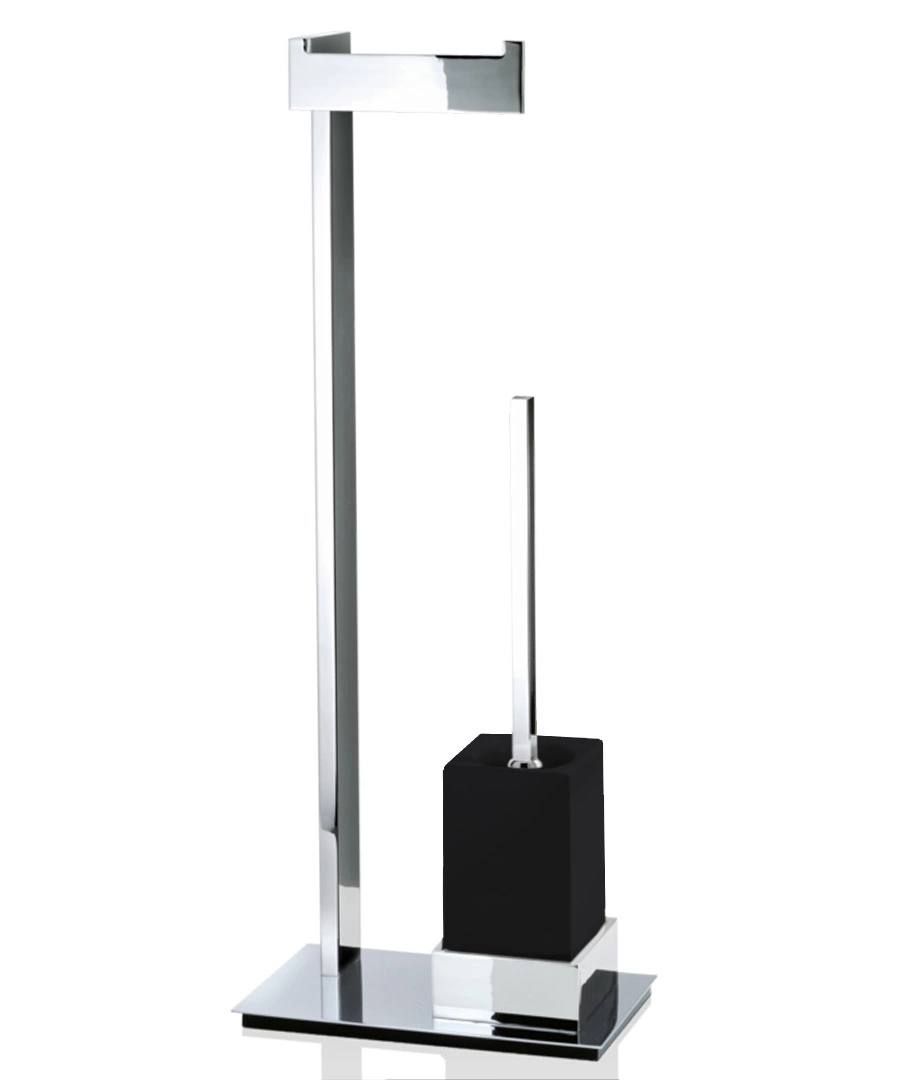 Stojak na papier toaletowy i szczotkę BRICK BK SBK marki Decor Walther. Podstawa i uchwyt na papier o prostokątnych kształtach wykonane z mosiądzu pokrytego chromem. Pojemnik na szczotkę prostokątny z czarnej porcelany na metalowej podstawce.
