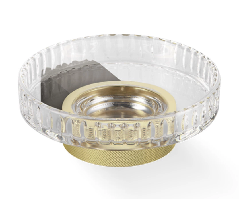 Naścienna mydelniczka CLUB STS marki Decor Walther z kolekcji CLUB. Okrągła forma, kryształ szlifowany, ozdobny pierścień wykonany z mosiądzu pokryty 24 karatowym złotem. Uchwyt mocujący do ściany w kolorze ciemnego metalu.