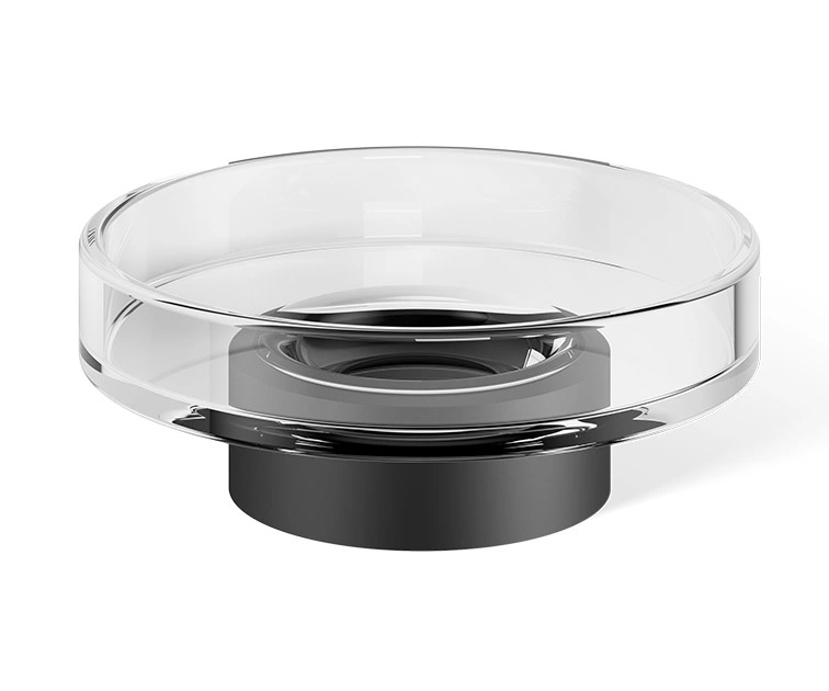 - Wolnostojąca mydelniczka CENTURY STS marki Decor Walther. Prosta okrągła forma, wykonana z przezroczystego, grubego szkła kryształowego, osadzona na pierścieniu wykonanym z mosiądzu lakierowanego na czarno. Można łączyć z kolekcją BAR i ROUND.