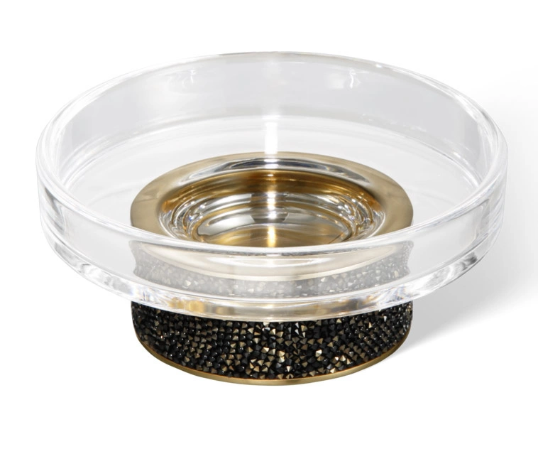 Wolnostojąca mydelniczka ROCKS STS marki Decor Walther. Okrągły kształt, wykonana z gładkiego szkła kryształowego, podstawa wykonana z mosiądzu w kolorze ciemnego metalu i 24 karatowego złota , ozdobiona kryształami Swarovski.