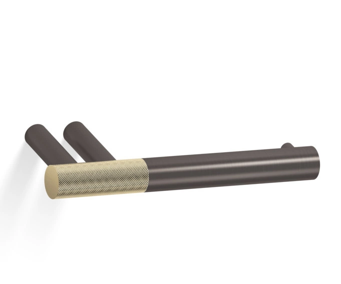 Wieszak na papier toaletowy CLUB TPH1 marki Decor Walhter. Wykonany mosiądzu w wykończeniu matowego surowego metalu oraz ze zdobieniem charakterystycznym dla tej kolekcji pokrytym 24-karatowym złotem w wykończeniu matowym.