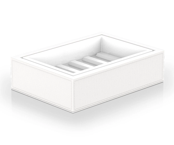 Mydelniczka wolnostojąca BROWNIE STS marki Decor Walther. Elegancka o prostokątnym kształcie. Wykonana z białej porcelany i skóry ekologicznej odpornej na wilgoć w kolorze białym. Idealna do każdej łazienki.