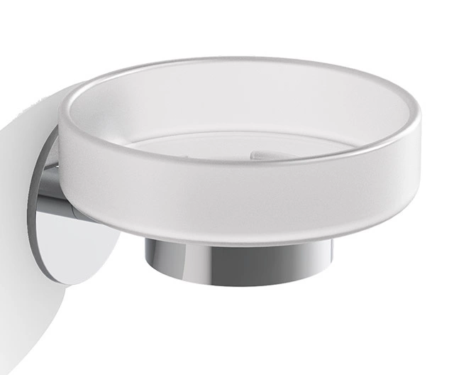 Mydelniczka ścienna BA SK WSS marki Decor Walther. Okrągła wykonana z matowego szkła, osadzona na podstawie ze stali nierdzewnej pokrytej chromem. Samoprzylepna, nie wymaga wiercenia śrubami w ścianie.