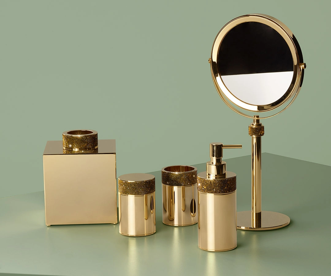• Pudełko na chusteczki kosmetyczne ROCKS KB marki Decor Walther. Kwadratowy kształt, wykonany z mosiądzu pokrytego 24 karatowym złotem. Zakończony pierścieniem ozdobionym kryształami Swarovski z otworem do wyciągania chusteczek.