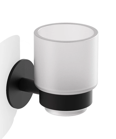 Kubek łazienkowy naścienny samoprzylepny BA SK WMG marki Decor Walther. Okrągły kubek wykonany z matowego szkła osadzony w uchwycie z mosiądzu lakierowanego na czarno. Nie wymaga wiercenia śrub w ścianie.
