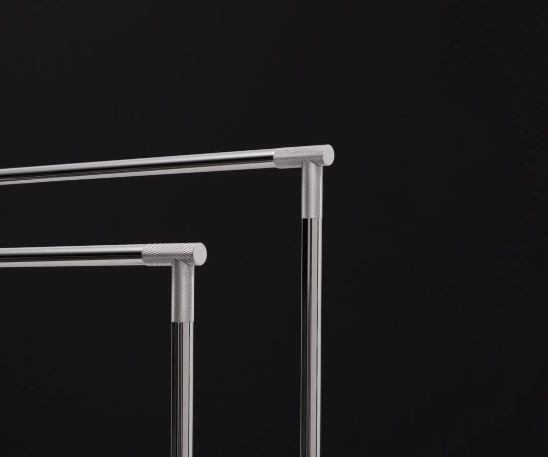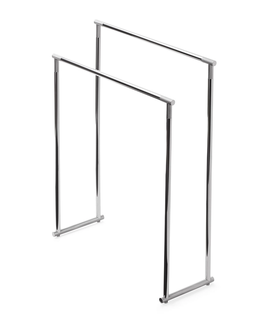 Stojak na ręczniki Club HT marki Decor Walther. Dwie poprzeczki umieszczone na różnych wysokościach, narożniki stojaka ozdobione charakterystyczną strukturalną powierzchnią. Wykonany z mosiądzu pokrytego chromem.