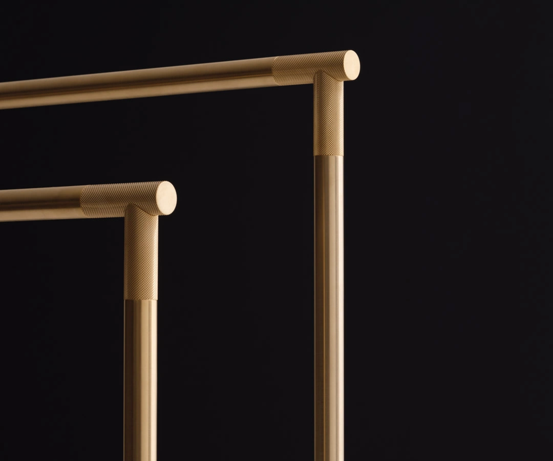 Stojak na ręczniki Club HT marki Decor Walther. Dwie poprzeczki umieszczone na różnych wysokościach, narożniki stojaka ozdobione charakterystyczną strukturalną powierzchnią. Wykonany z mosiądzu pokrytego 24 karatowym matowym złotem.