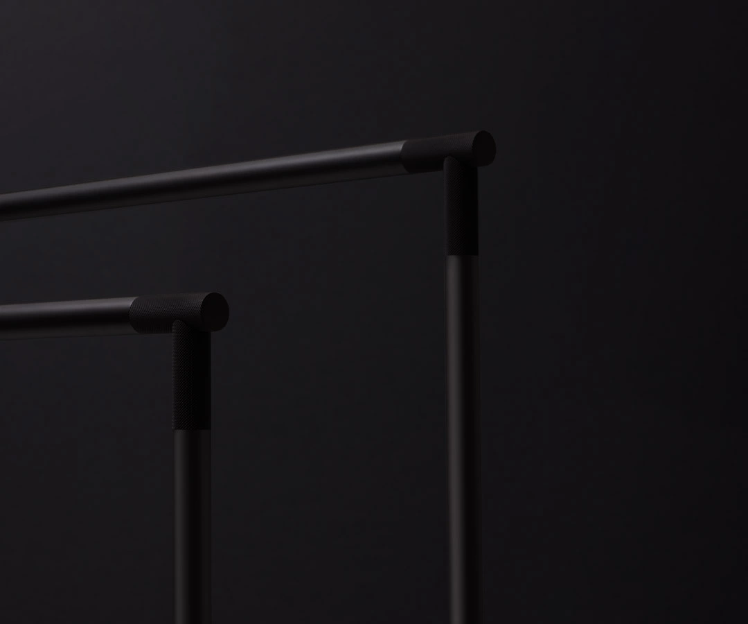 - Stojak na ręczniki Club HT marki Decor Walther. Dwie poprzeczki umieszczone na różnych wysokościach, wykonany z mosiądzu lakierowanego na czarno. Narożniki ozdobione charakterystyczną strukturalną powierzchnią.