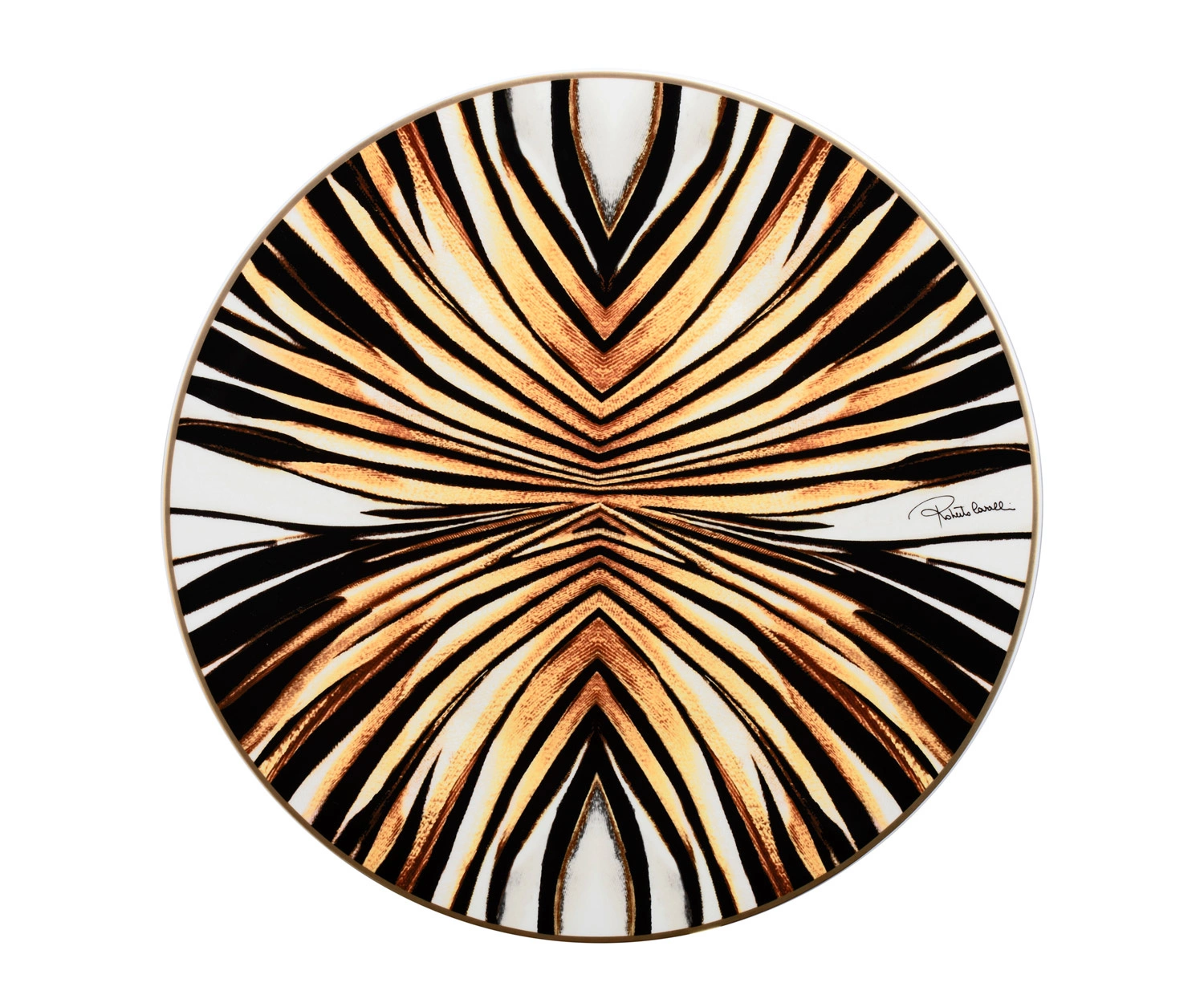 Podtalerz Ray of Gold marki Roberto Cavalli. Kolekcja zainspirowana światłem i słońcem zamienionymi w wyrafinowany graficzny wzór. Wykonany z porcelany kostnej. Z ręcznie malowanymi złoceniami. Możliwość mycia w zmywarce.