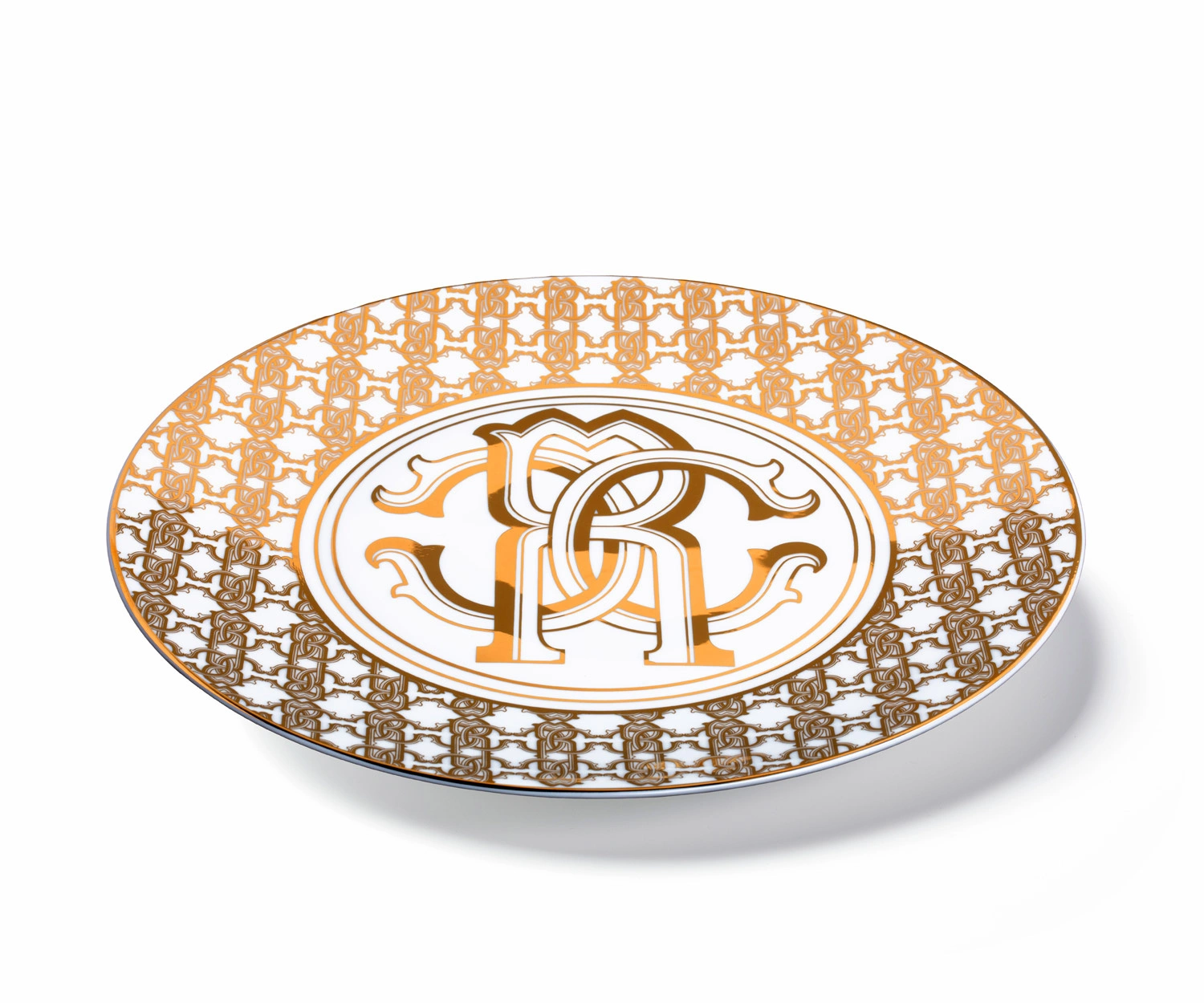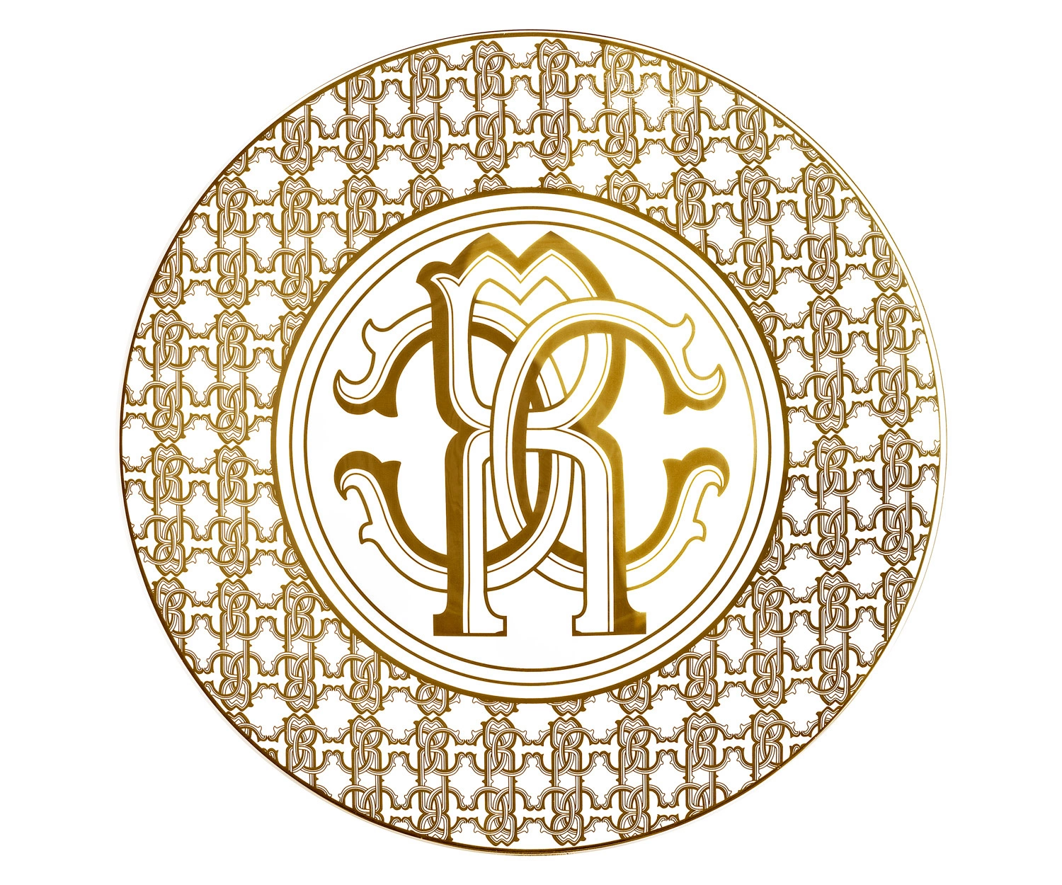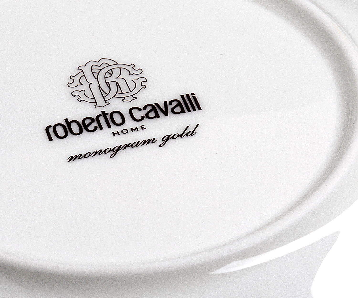 - Podtalerz Monogram od marki Roberto Cavalli. Najbogatszy wzór ofercie projektanta. Biała porcelana kostna z powtórzonym monogramem w korze złotym. Brzeg ręcznie malowany złotem.