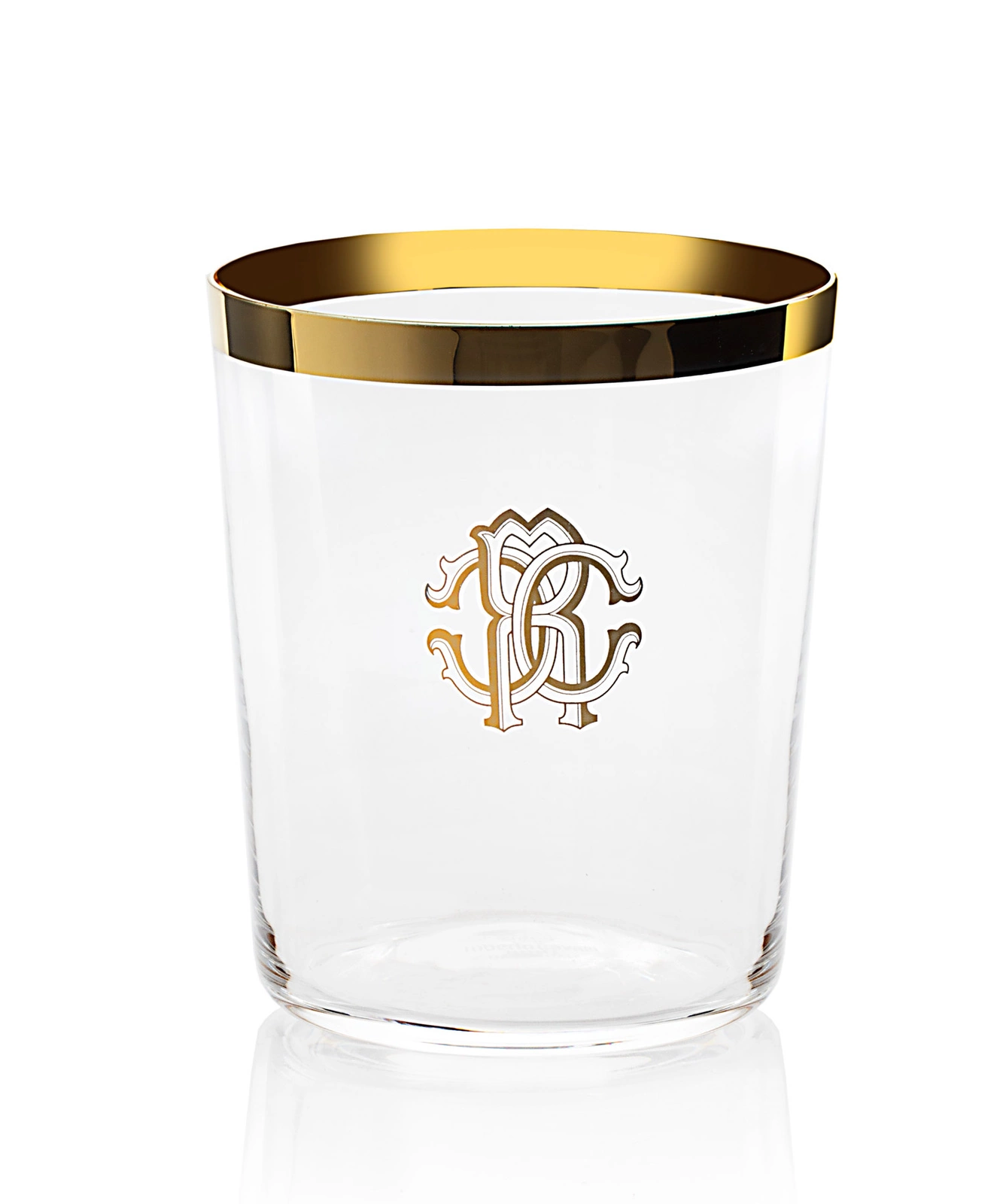 Szklanka do whisky typu Old Fashion z kolekcji New Monogram Gold od marki Roberto Cavalli. Wykonana ze szkła, ozdobiona ręcznie malowanym, złotym brzegiem. W centrum efektowny monogram.