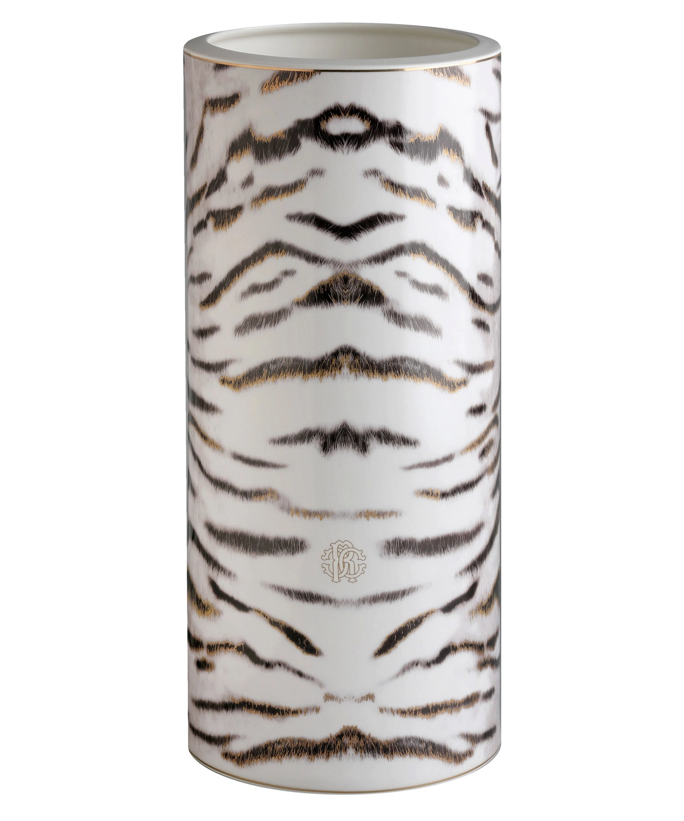 - Duży wazon na kwiaty od marki Roberto Cavalli. Wzór Tiger, zwierzęcy motyw tygrysa na białej porcelanie. Ozdobiony malutkim monogramem oraz ręcznie malowanymi złoceniami. Wykonany z najwyższej jakości porcelany kostnej.