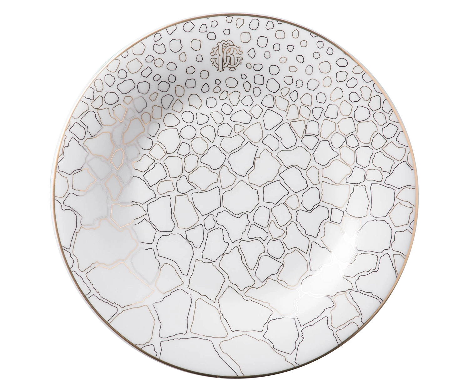 Talerz deserowy od marki Roberto Cavalli. Kolekcja Giraffa, biała porcelana z ręcznie złoconym i platynowanym motywem żyrafy. Mały monogram w centrum. Wykonany z najwyższej jakości porcelany kostnej. Możliwość mycia w zmywarce. Zestaw 6 sztuk.