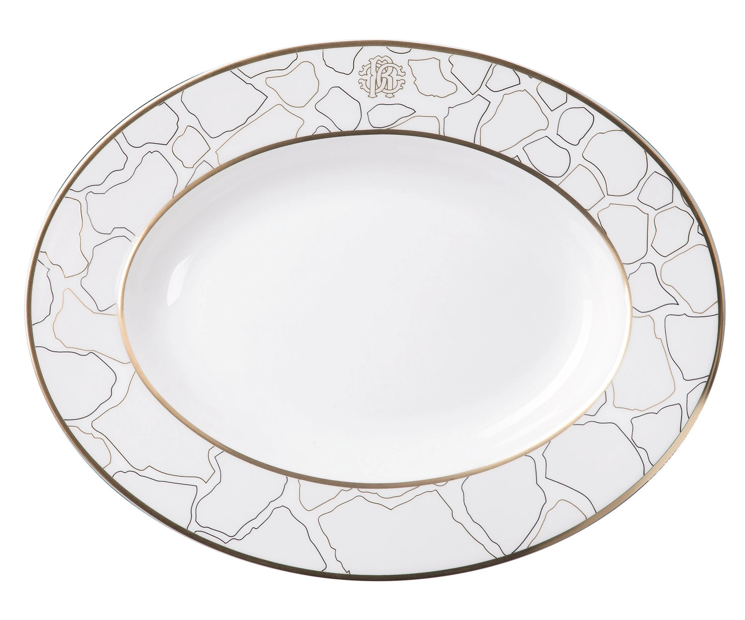 - Półmisek 23 cm od marki Roberto Cavalli. Kolekcja Giraffa, biała porcelana z ręcznie złoconym i platynowanym motywem żyrafy. Mały monogram w centrum. Wykonany z najwyższej jakości porcelany kostnej. Możliwość mycia w zmywarce.