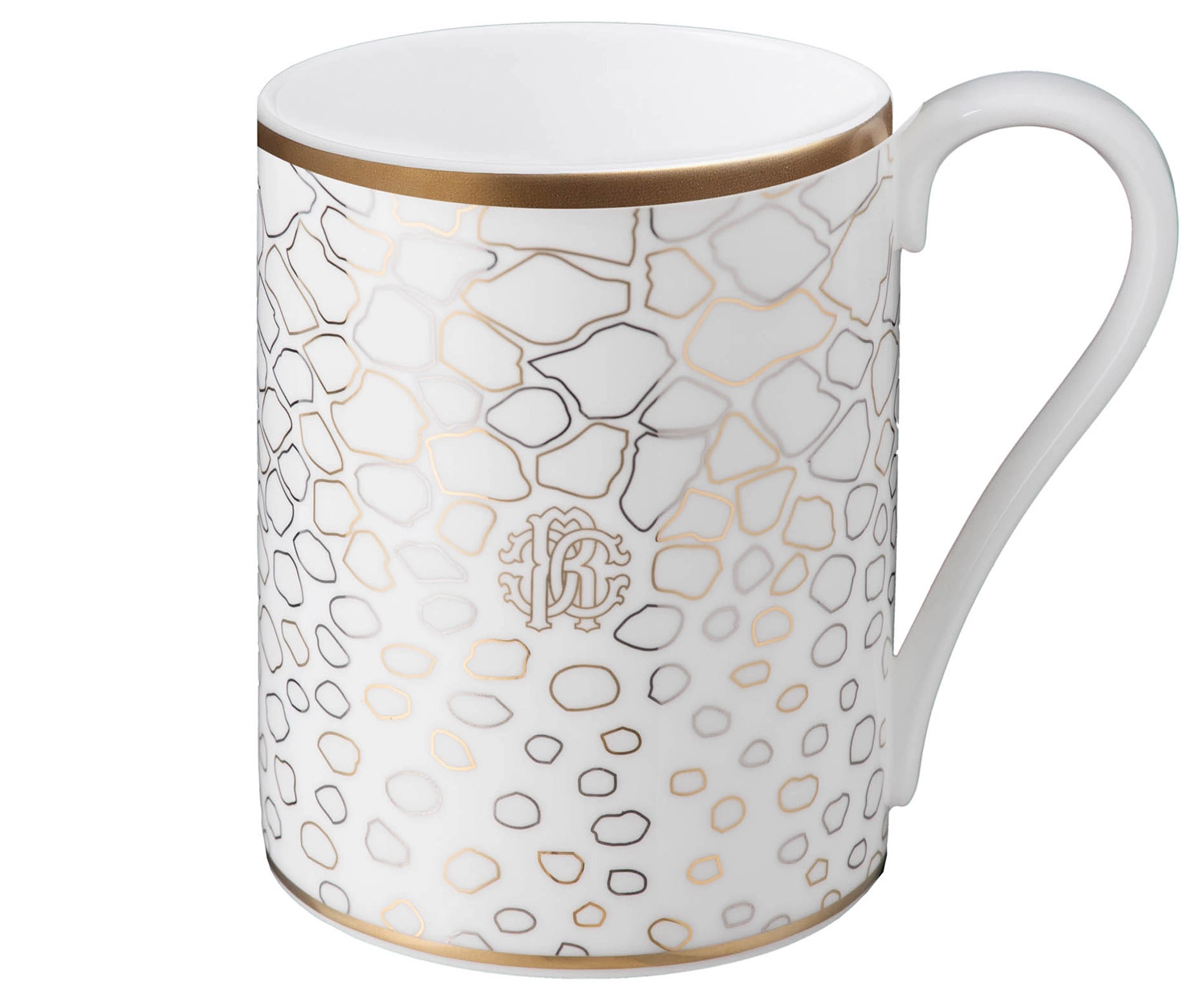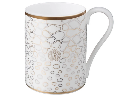 - Kubek od marki Roberto Cavalli, zapakowany w eleganckie pudełko. Kolekcja Giraffa, biała porcelana z ręcznie złoconym i platynowanym motywem żyrafy. Mały monogram w centrum. Wykonany z najwyższej jakości porcelany kostnej. Do mycia w zmywarce.