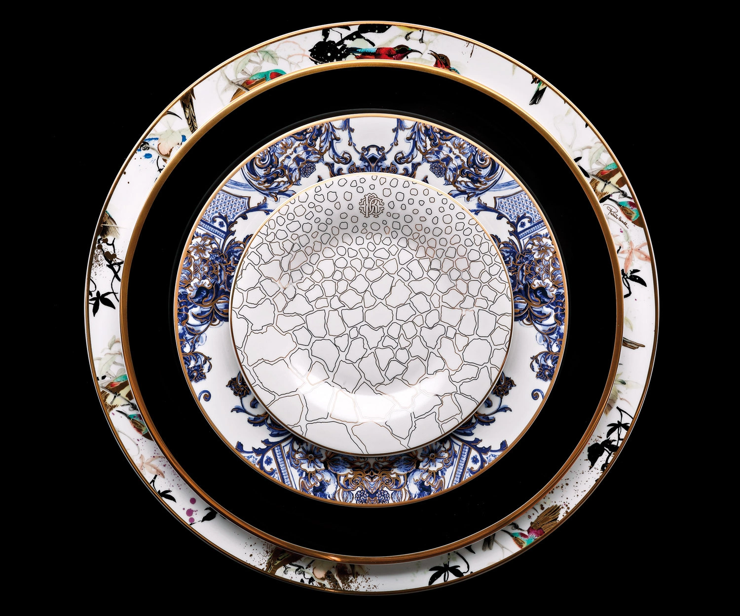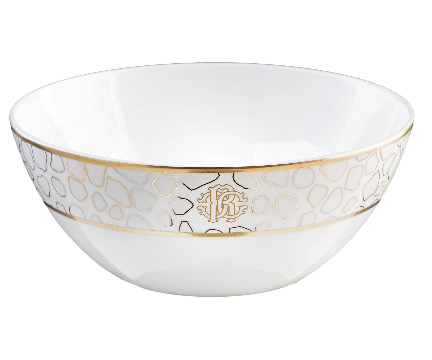 - Miska do zupy od marki Roberto Cavalli. Kolekcja Giraffa, biała porcelana z ręcznie złoconym i platynowanym motywem żyrafy. Mały monogram w centrum. Wykonana z najwyższej jakości porcelany kostnej. Zestaw 6 sztuk. Możliwość mycia w zmywarce.