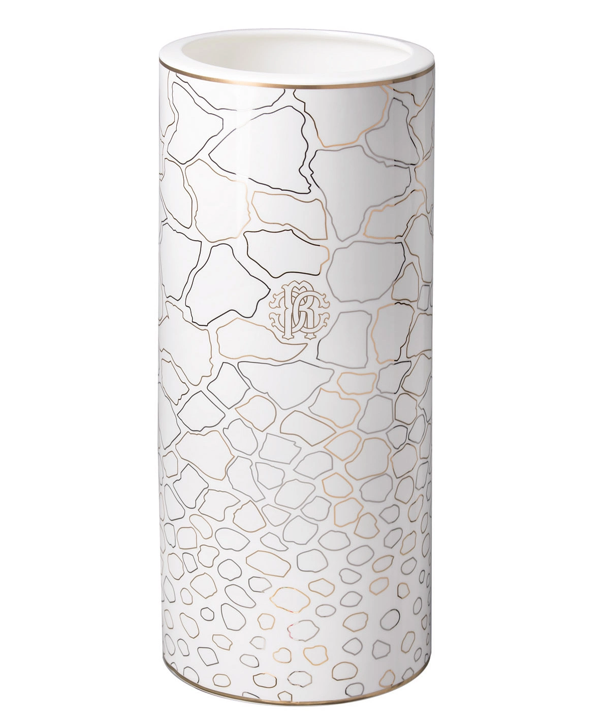 - Duży wazon na kwiaty od marki Roberto Cavalli. Kolekcja Giraffa, biała porcelana z ręcznie złoconym i platynowanym motywem żyrafy. Mały monogram w centrum. Wykonany z najwyższej jakości porcelany kostnej.
