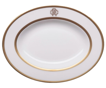 - Półmisek 23 cm Silk Gold od marki Roberto Cavalli. Luksusowa porcelana kostna w kolorze białym z ręcznie malowanymi złoceniami i monogramem projektanta. Możliwość mycia w zmywarce.