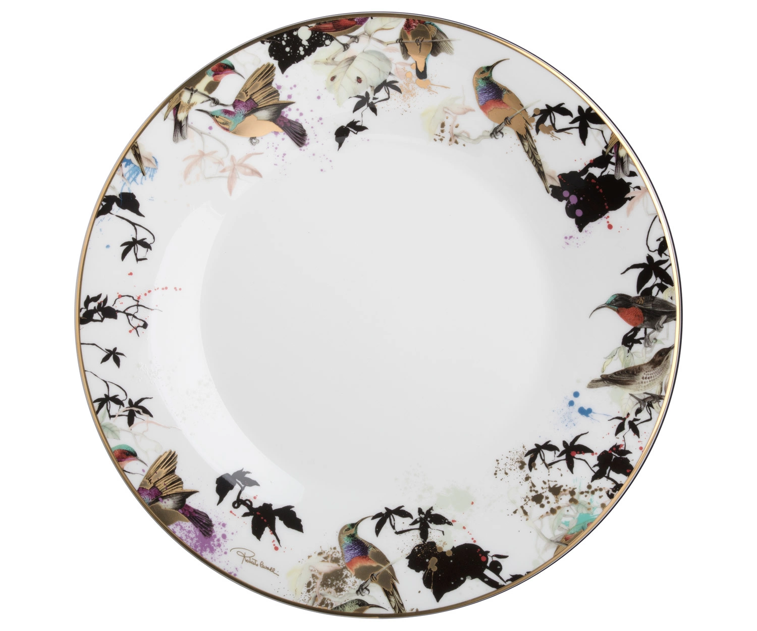 Talerz obiadowy Garden's Birds marki Roberto Cavalli. Motyw ptaków zaczerpnięty z kolekcji modowej projektanta z 2016 roku. Wykonany z porcelany kostnej, ręcznie ozdabiany złotymi elementami. Zestaw 6 sztuk. Możliwość mycia w zmywarce.